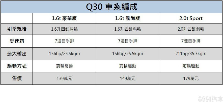 高性價比會是吸引消費者入主Q30的考量之一,不但配備比GLA來得齊全許多,中階車型以上均標配ACC主動跟車、360度環景攝影與全景天窗等項目,動力等級若換算成賓士代號,Q30 1.6t就是GLA200,而Q30 2.0t則為台灣未引進的GLA250,但是價格卻相對親民不少,頂規的Q30 2.0t Sport售價179萬元,甚至比GLA180運動版(182萬元)還便宜,若是不在乎品牌高低,Q30會是C/P值頗高的選擇。
