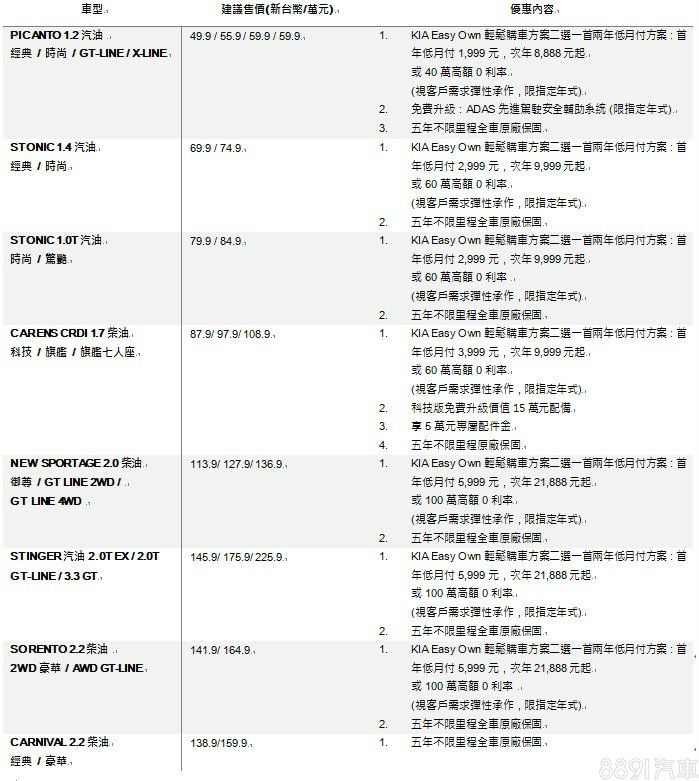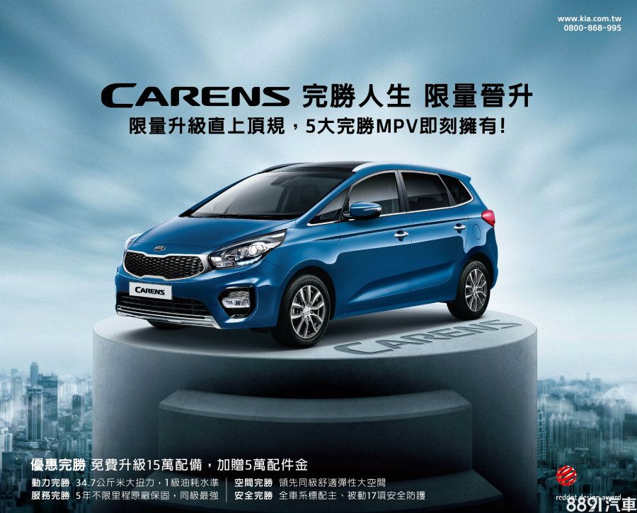 Kia於本月推出「Carens完勝人生 限量晉升」專案:包含免費升級包含全景式天窗、智慧感應啟動系統、4.2吋TFT-LCD Supervision智慧電腦旅程儀表等多達10項以上的配備,整體總價值高達15萬,購車可再享有5萬專屬配件金,並免費升級五年不限里程原廠保固、另有輕鬆購車方案:首兩年享低月付或高額分期零利率二選一。