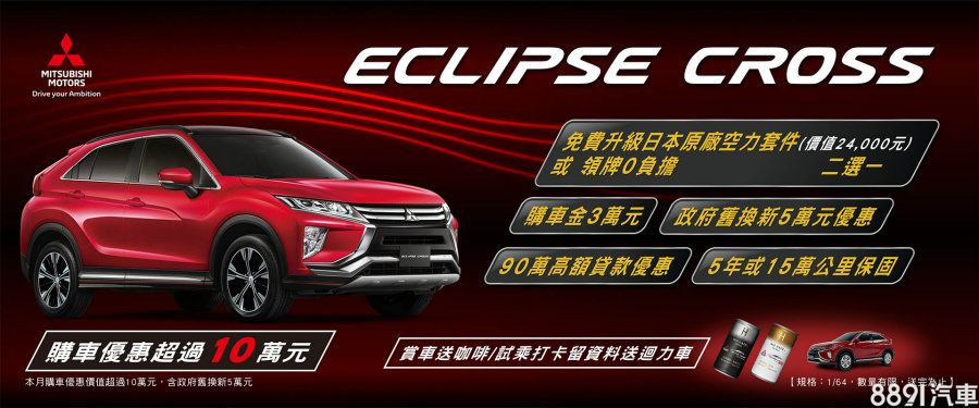 正20年式Eclipse Cross菁英型升級智慧感應鑰匙與Push Start智慧觸控啟動系統,另外本月入主Eclipse Cross任一車款,享3萬元購車金、免費升級日本原廠空力套件組(價值24000元)或領牌零負擔(含免牌燃稅、領牌費、強制險)、政府舊換新5萬元補助優惠、5年或15萬公里保固以及90萬高額貸款優惠,優惠總價值超過10萬元。