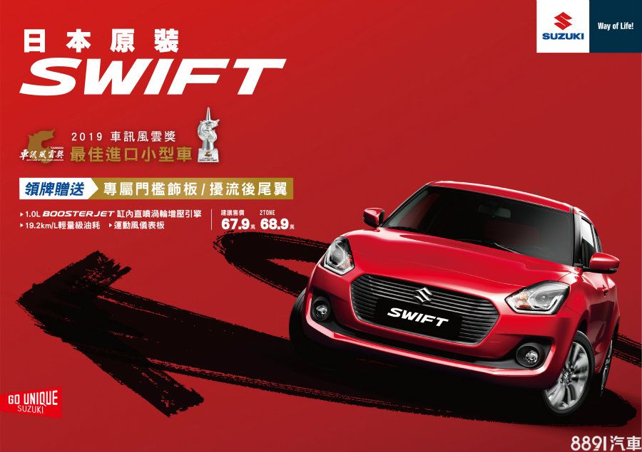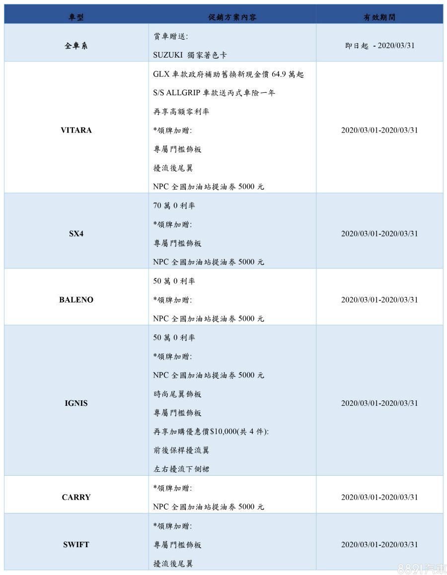 凡入主Vitara頂規車款加送首年丙式車險,且享高額零利率,本月底前領牌再免費加贈「運動風擾流尾翼」及「專屬迎賓門檻飾板」,購買全車系還有NPC全國加油站提油券5000元;3月底領牌SX4則加贈「專屬門檻飾板」;IGNIS可獲得「時尚尾翼」以及「專屬門檻飾板」兩項好禮,以及「前/後保桿擾流翼+左右擾流下側裙」共計4件車身套件加購優惠方案。至於Carry領牌即享5000元加油金;Swift同樣免費升級「擾流後尾翼」及「專屬門檻飾板」。