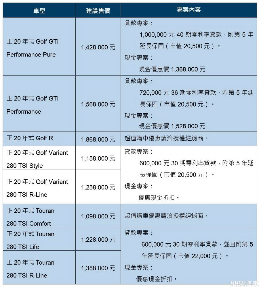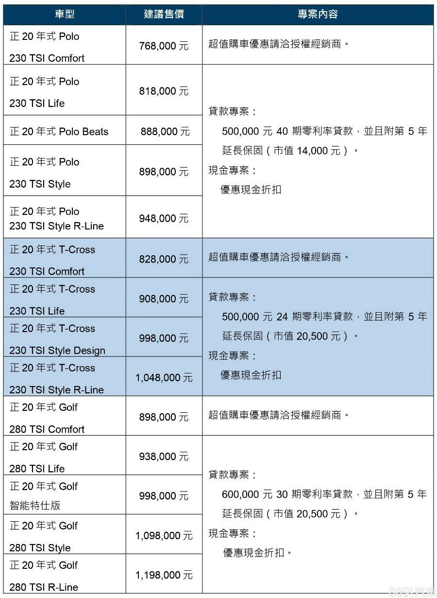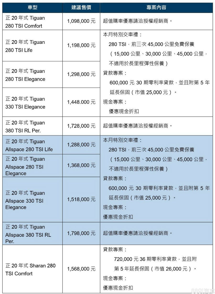 入主2020年式Touan指定車型之新購車主,即享60萬30期零利率貸款,並且享有免費第5年延長保固(市價22000元);Tiguan/Tiguan Allspace凡於本月入主2020年式指定車型,同享60萬30期零利率貸款,並且享有免費第5年延長保固(市價25000元)。