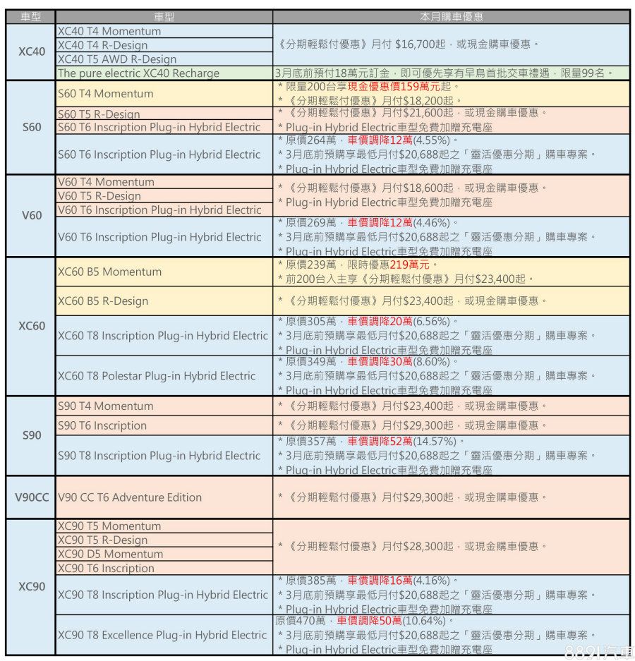 全車系20/正20年式指定車型除了適用分期輕鬆付優惠專案,S60 T4 Momentum限量200台享現金優惠價159萬元起;S60/V60 T6 Inscription車價調降12萬;XC60 B5 Momentum原價239萬,限時優惠219萬元;XC60 T8 Inscription車價調降20萬;XC60 T8 Polestar調降30萬;S90 T8 Inscription最高調降52萬;XC90 T8 Inscription、XC90 T8 Excellence則分別調降16、50萬元。