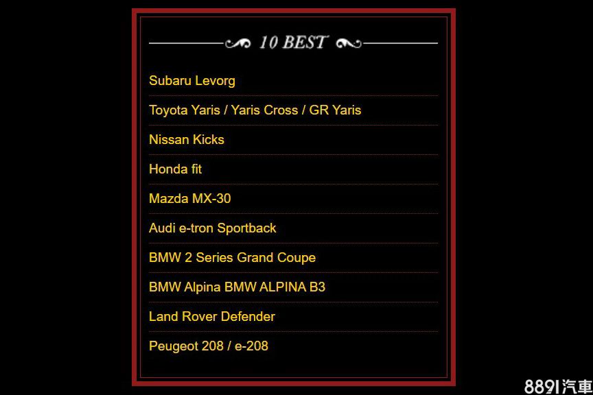 前10名入選新車為:Subaru Levorg、Toyota Yaris/Yaris Cross/GR Yaris、Nissan Kicks、Honda Fit、Mazda MX-30、Audi e-tron Sportback、BMW 2 Series Gran Coupe、BMW Alpina B3、Land Rover Defender和Peugeot 208/e-208,並會在12/7公布本屆日本年度風雲車到底「花落誰家」。