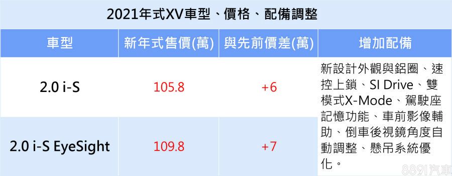 2021年式XV提供2.0 i-S、2.0 i-S EyeSight兩車型,分別開出105.8、109.8萬元之售價,較先前漲幅各為6、7萬元,不過除了外觀換上分別已於美規、日規可見的嶄新設計與18吋鋁圈之外,配備也進行升級,細節如附表。