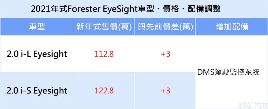 2021年式Forester縮編為2.0 i-L Eyesight、2.0 i-S Eyesight兩車型編成,均較先前在售價上有著3萬之漲幅,分別為112.8與122.8萬元,配備上同步追加DMS駕駛行車監控系統,當系統偵測到駕駛眼應有閉上或未專注前方路況時,會予以儀錶警示並發出聲響,強化行車安全。