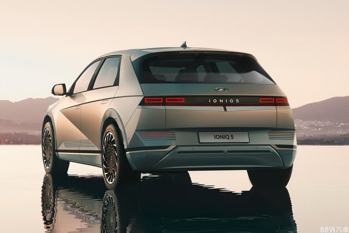Ioniq 5整體尺碼約比Santa Fe略小一些,但軸距卻比品牌旗艦Palisade更大,達3000mm之譜,外觀與2019法蘭克福車展亮相的Hyundai 45 Concept概念車相似度極高,融合極簡與前衛的設計語彙,LED頭燈組和日行燈辨識度極高,前保桿與車側的線條設計則增添視覺上的速度與科技感。
