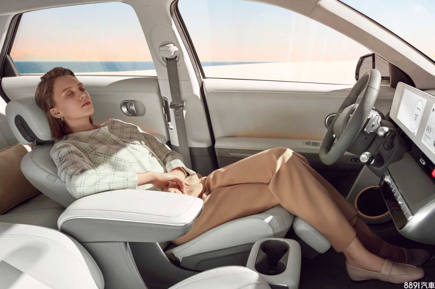 拜E-GMP「空間最大化」的特徵之賜,原廠強調Ioniq 5的寬敞車室空間,雙前座為電動調整,能支援的後傾幅度大,並刻意將椅背設計的更加輕薄,以增加後排乘員的腿部空間。