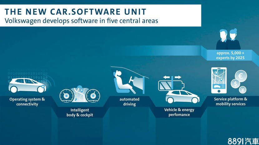 福斯除了在電池與開發平台上最大限度的進行模組化生產,連未來集團所使用的車用軟體也打算全面標準化,福斯在2020年時就先成立一個Car.Software部門,負責開發和維護公司專用的VW.OS作業系統,就像iOS和Android一樣,這個新作業系統的1.2版將在PPE平臺上推出,2.0版將在SSP平臺上推出,這套系統將有60%是福斯自己研發,預計從2025年開始,所有福斯集團車款都會統一搭載VW.OS,軟體系統將會是未來智慧車輛技術的核心重點。