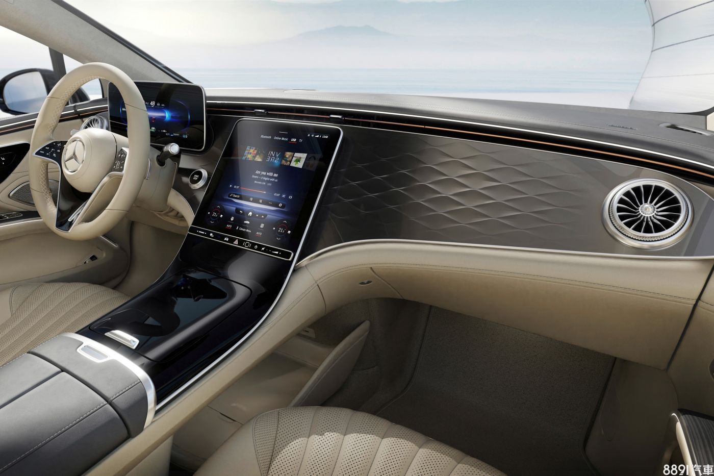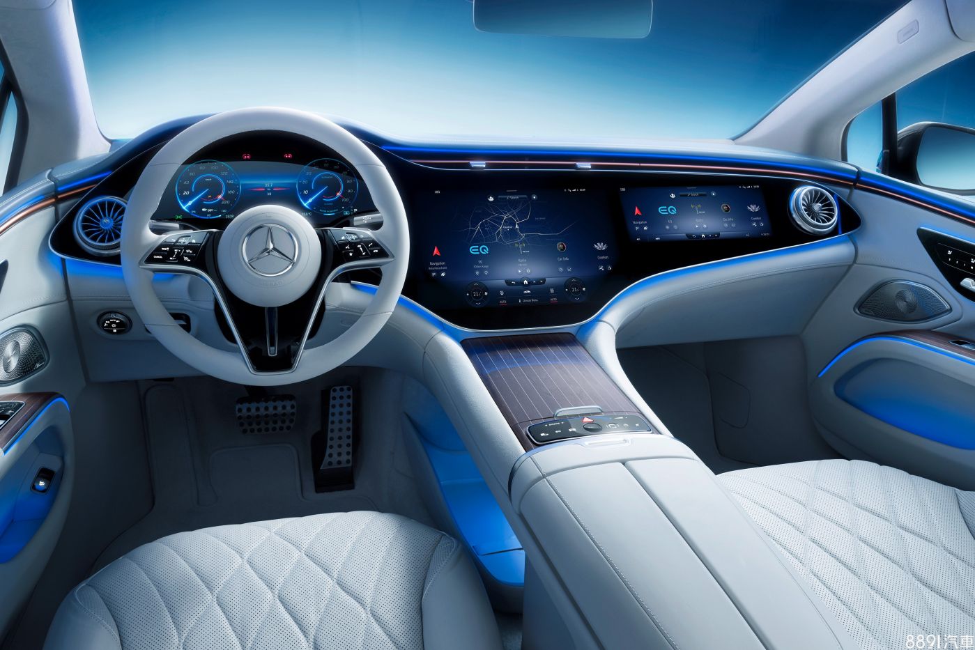 EQS座艙明顯融入S-Class的設計元素,但風格驅於簡約,標配12.3吋數位儀錶及12.8吋直立式中控觸控螢幕,後者內建標配AR擴增實境導航服務,至於AR抬頭顯示器則採選配提供。方向盤則同S-Class,依AMG-Line套件的有無搭配平底式或圓形方向盤。