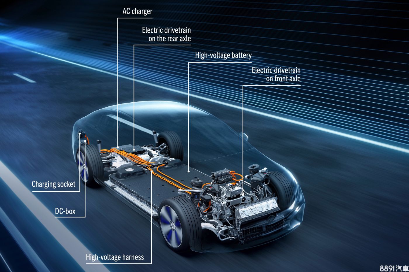 電池組藏於座艙之下,提供90kWh及107.8kWh兩種規格可選,若同搭107.8kWh版本,入門款至靜止加速至100km/h需6.2秒,四驅款雖說車重多了105kg,卻僅需4.3秒達標,兩車極速皆限制於210km/h。至於原廠宣稱之770km最高續航里程,並未公布是採用何種動力及電池規格所測得。