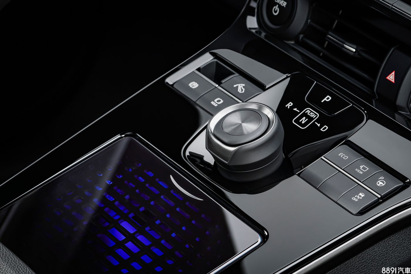 採用旋鈕式排檔,中央鞍座的置物空間加諸藍色氛圍燈妝點,呼應新能源車之身分,也增添些許科技感。