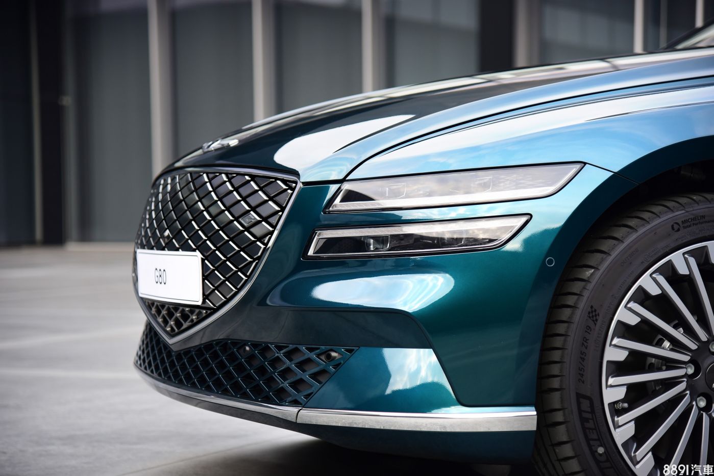 電動版G80基本上延續一般版獨特動感的家族化外型,因應電動車身分將水箱護罩改為封閉式,並將充電孔設置於此;下方的進氣壩造型也做了微幅修改,不變的則是Quad Lamps雙條式LED頭燈,也是品牌當今的特徵設計。