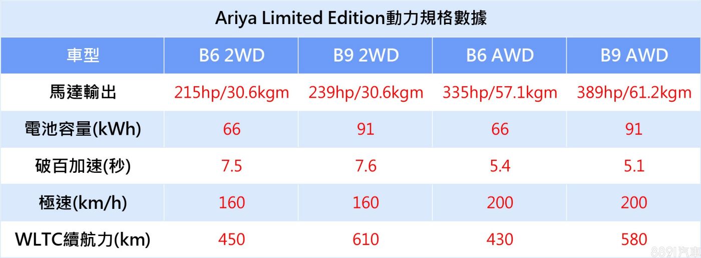 Ariya Limited提供單馬達2WD和雙馬達+e-4ORCE兩種動力配置,依電池組容量之不同,分為B6(66 kWh)和B9(91kWh)共4車型,詳細規格與數據可參考附表。