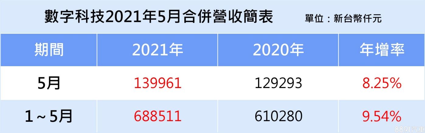 今年五月全國進入第三級疫情警戒,數字科技以保障團隊成員健康為首要目標,仍繳出營運亮眼的成績,主要係公司擁有超過千萬會員人數,加上持續發展多元且便利的服務,如台灣 591 房屋新增VR看屋及更友善的實價登錄服務、8891汽車開發各項新車資訊及影音等多元化內容,帶動 591房屋及8891汽車5月營收均雙位數成長,加上518熊班更名並推出更貼合用戶之履歷服務及收費模式,518熊班5月營收逆勢成長,推升公司整體5月合併營收1.40億元,年增率8%,累計前5月合併營收6.69億元,年增率10%。