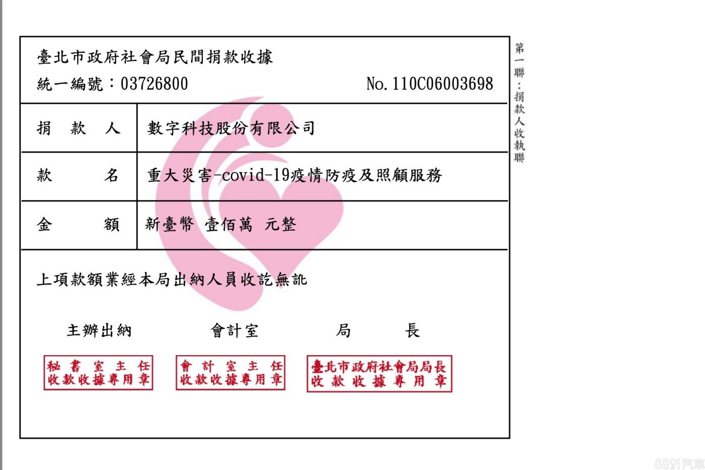台灣本土疫情蔓延,醫療與警政消防的需求擴張,數字科技第一時間捐款予臺北市及新北市政府防疫基金各新臺幣100萬元,共計捐出新臺幣200萬元防疫救助金,齊心為前線的防疫醫護人員、警政消防人員等,增添防疫保護等相關設備,齊力為台灣守護家園,期許在國人一起努力抗疫下,早日讓疫情趨緩,讓國人重回健康的生活。