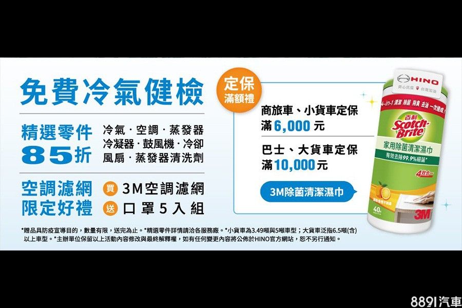 疫情當下,Hino推出回廠保養送防疫相關贈品活動,凡商旅車、小貨車定保消費滿6千元,或巴士、大貨車定保消費1萬元,即可獲得定保滿額禮:3M除菌清潔濕巾乙個。此外也推出特定商品限定好禮,只要在活動期間,購入3M空調濾網1個,就送口罩5入組1份。