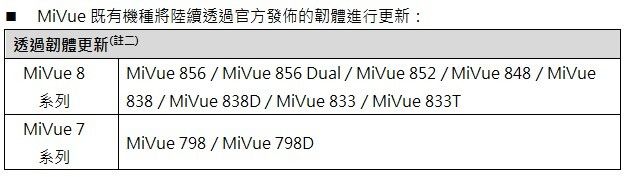 註二:所列機種需更新至最新韌體及測速點資料,才能使用Mio安全預警六合一測速照相功能。其他部分現有系列與機種,因硬體限制無法支援此功能,請使用者隨時至官網技術支援查詢(https://support.mio.com/Mio.htm) 。