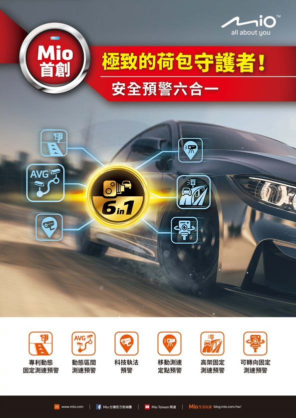 安全預警六合一整合了動態預警、動態區間測速、科技執法預警、高架固定測速預警、移動測速定點預警、可轉向固定測速預警等六大功能,將於Mio最新行車記錄器MiVue 887搭載,未來MiVue 8系列、MiVue 7系列其他機型,也將陸續透過官方免費韌體更新,讓更多使用者體驗。