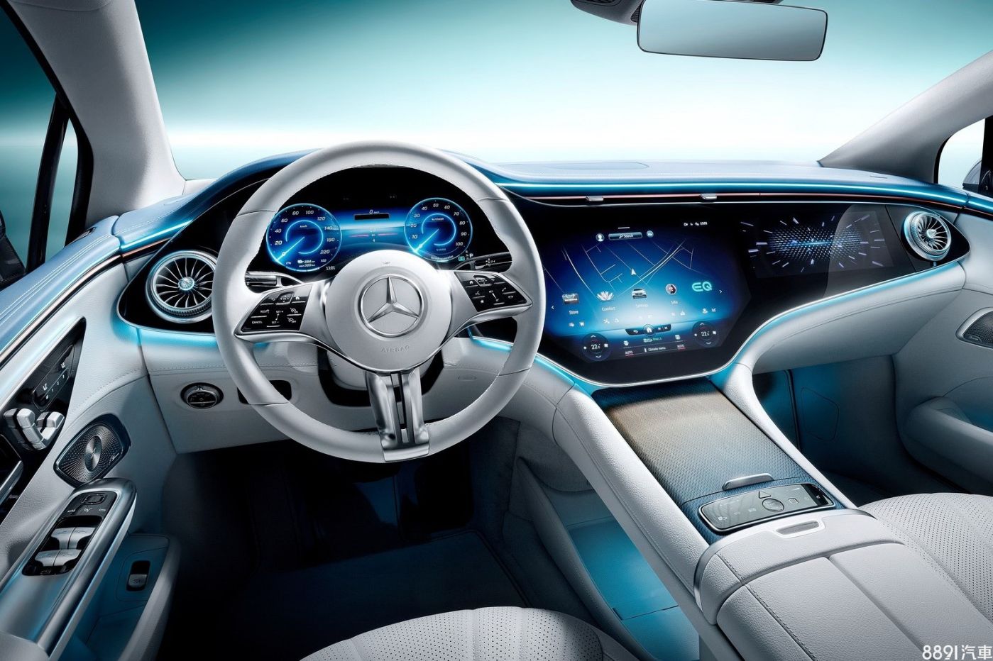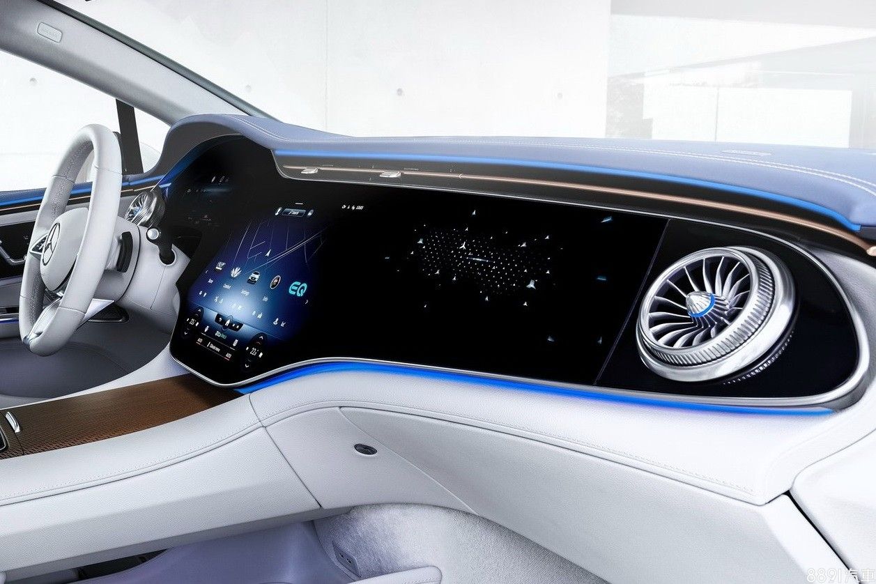 車室包含方向盤、以渦輪為靈感設計的空調出風口等,都是品牌常見的配置,也和EQS有著極高的相似度,最亮眼的自然是採用曲面觸控式液晶螢幕、自駕駛至副駕駛座、橫貫中控、使用OLED技術、支援觸控反饋的MBUX Hyperscreen,長達141cm,由12.3吋數位儀錶、17.7吋中控觸控式螢幕、12.3吋副駕駛座觸控式螢幕組成,科技感十足,M.Benz也「掛保證」,大面積螢幕不會因為炎熱氣候或室外高溫導致其變形。