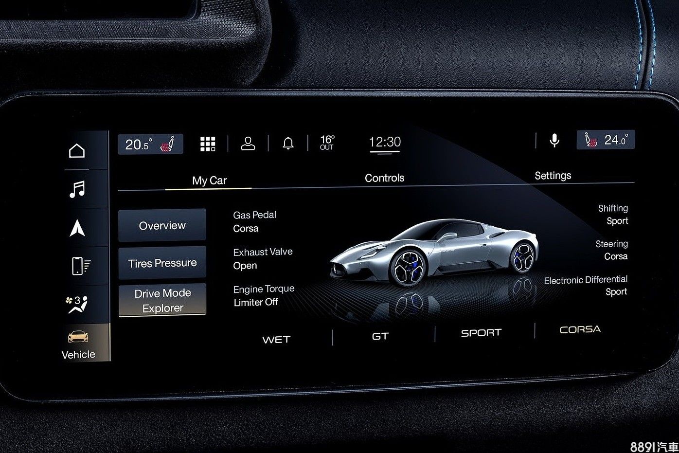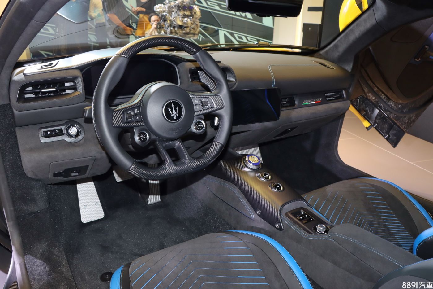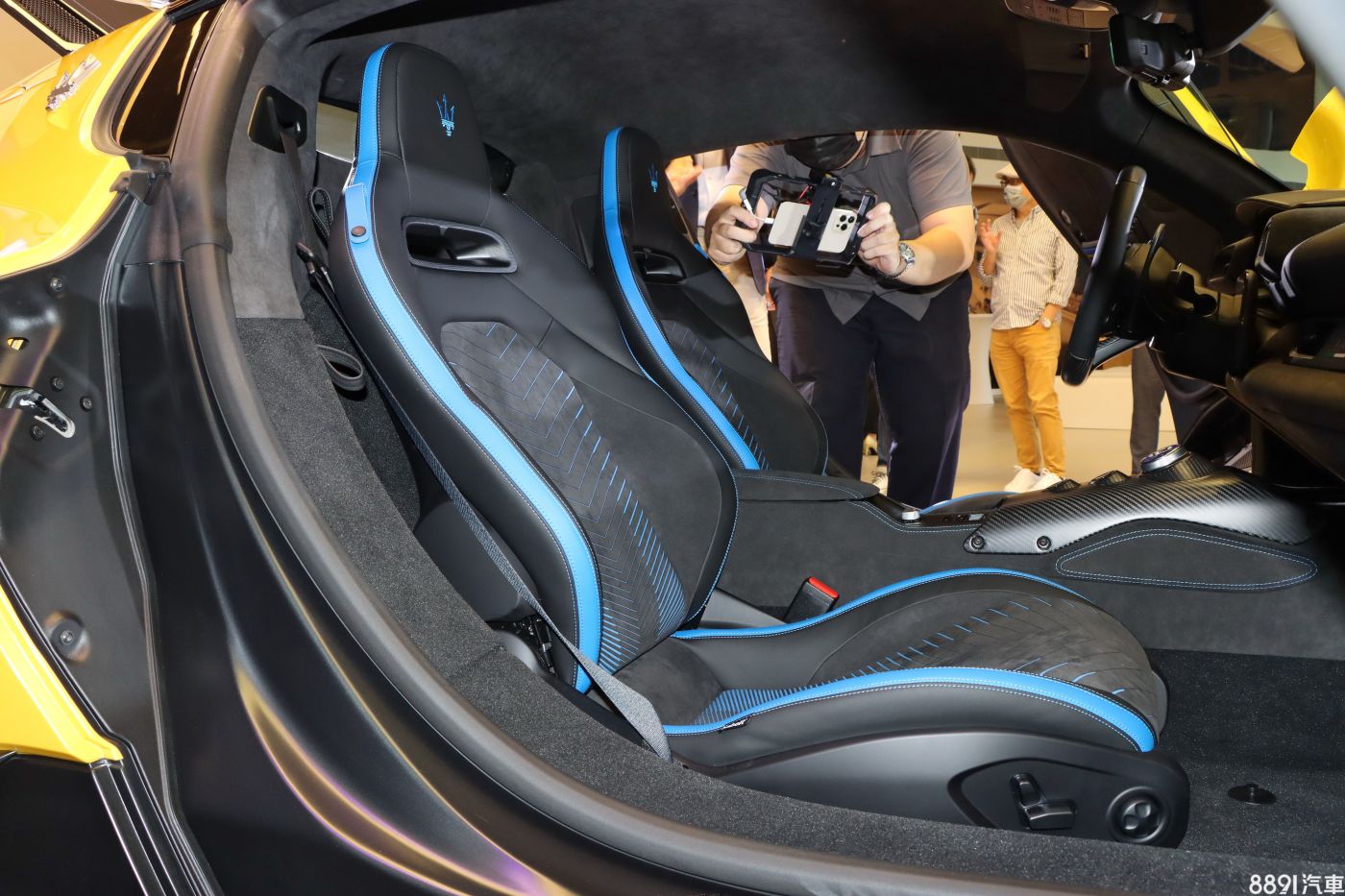 配置兩張跑車化座椅,剪裁立體,支援10向電動調整含腰靠,椅面選用黑藍雙色對比,副駕駛座前方並有「MC20」壓印內飾板彰顯身分。