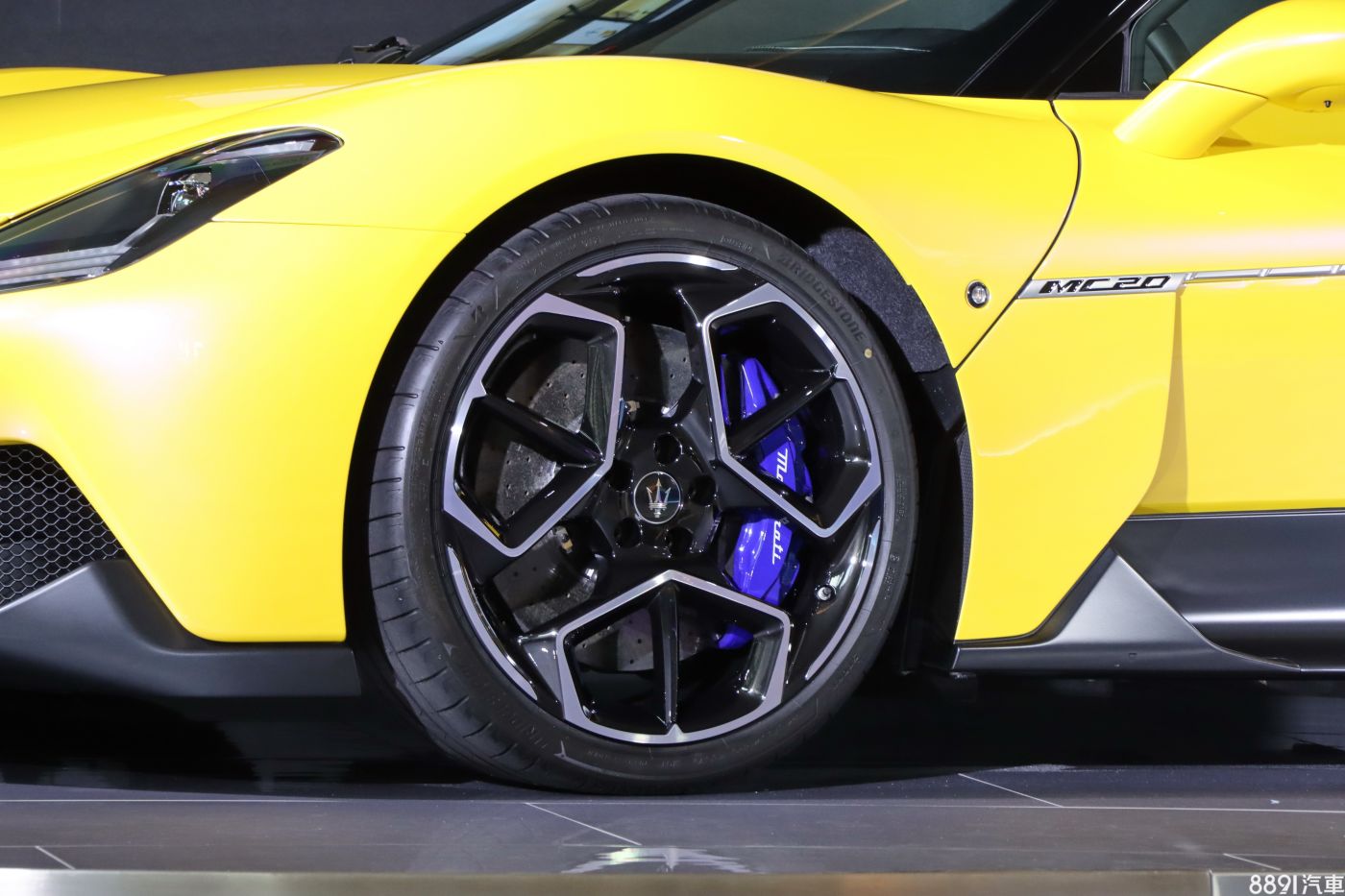 展示車選配要價6.9萬的20吋鋁圈,以及同樣需加價6.9萬的藍色煞車卡鉗,國內將前390mm、後360mm的碳纖維陶瓷碟盤列為標配項目。搭配的是特別定製的前245/35R20、後305/30R20普利司通Potenza Sport性能跑胎。