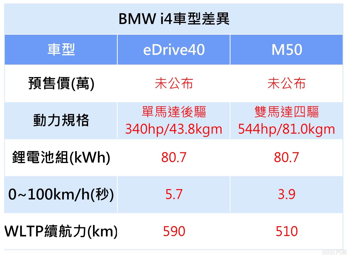 至於終於展開量產的i4,視海運船期而定,國內總代理預估最快有望在年底前抵台開賣,最晚也會在明年首季發表上市,雖說官方尚未提供預售價格,不過已預告不論340hp的「eDrive40」或544hp的「M50」車型,兩種動力皆會在台灣市場供應。