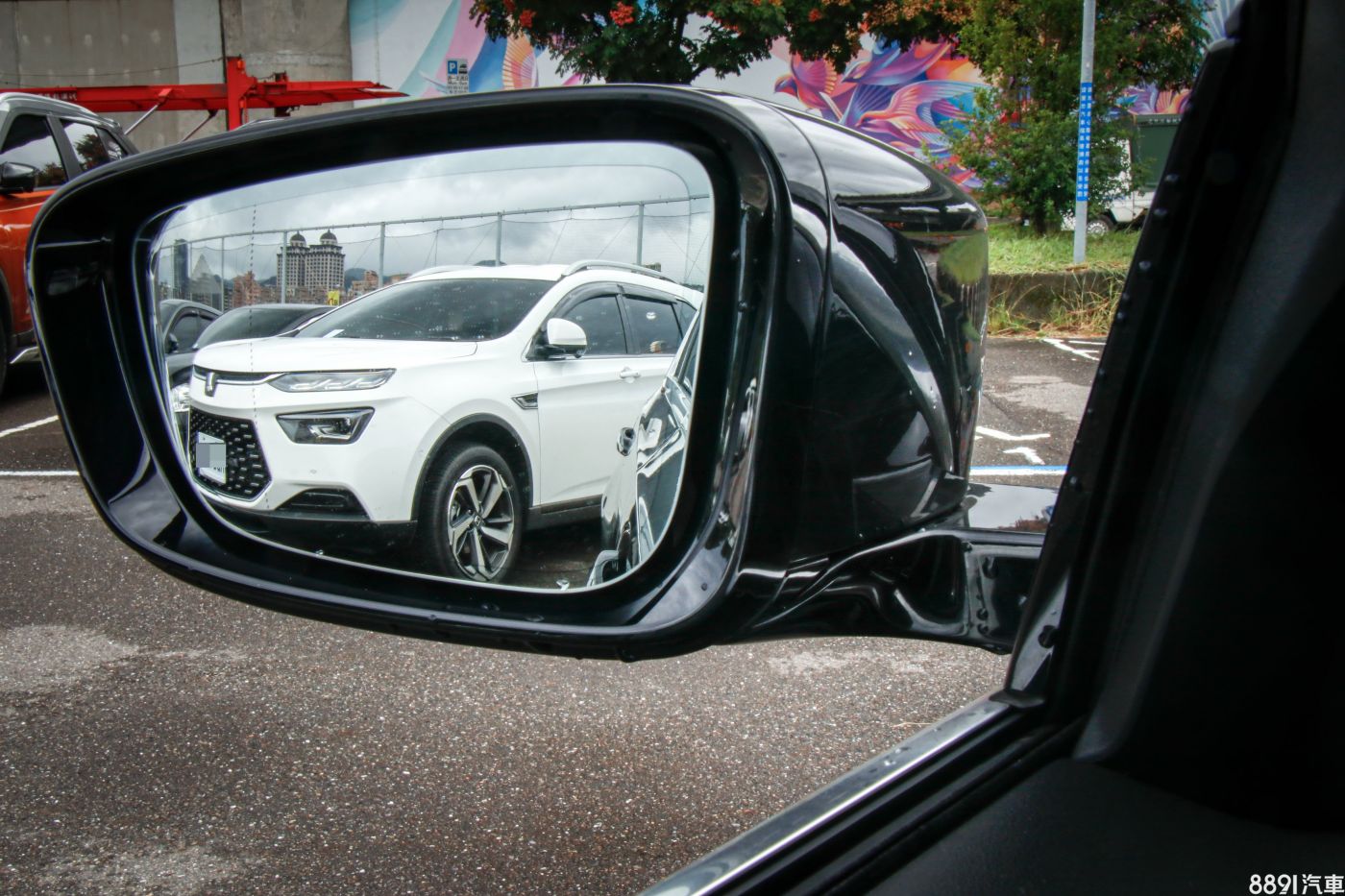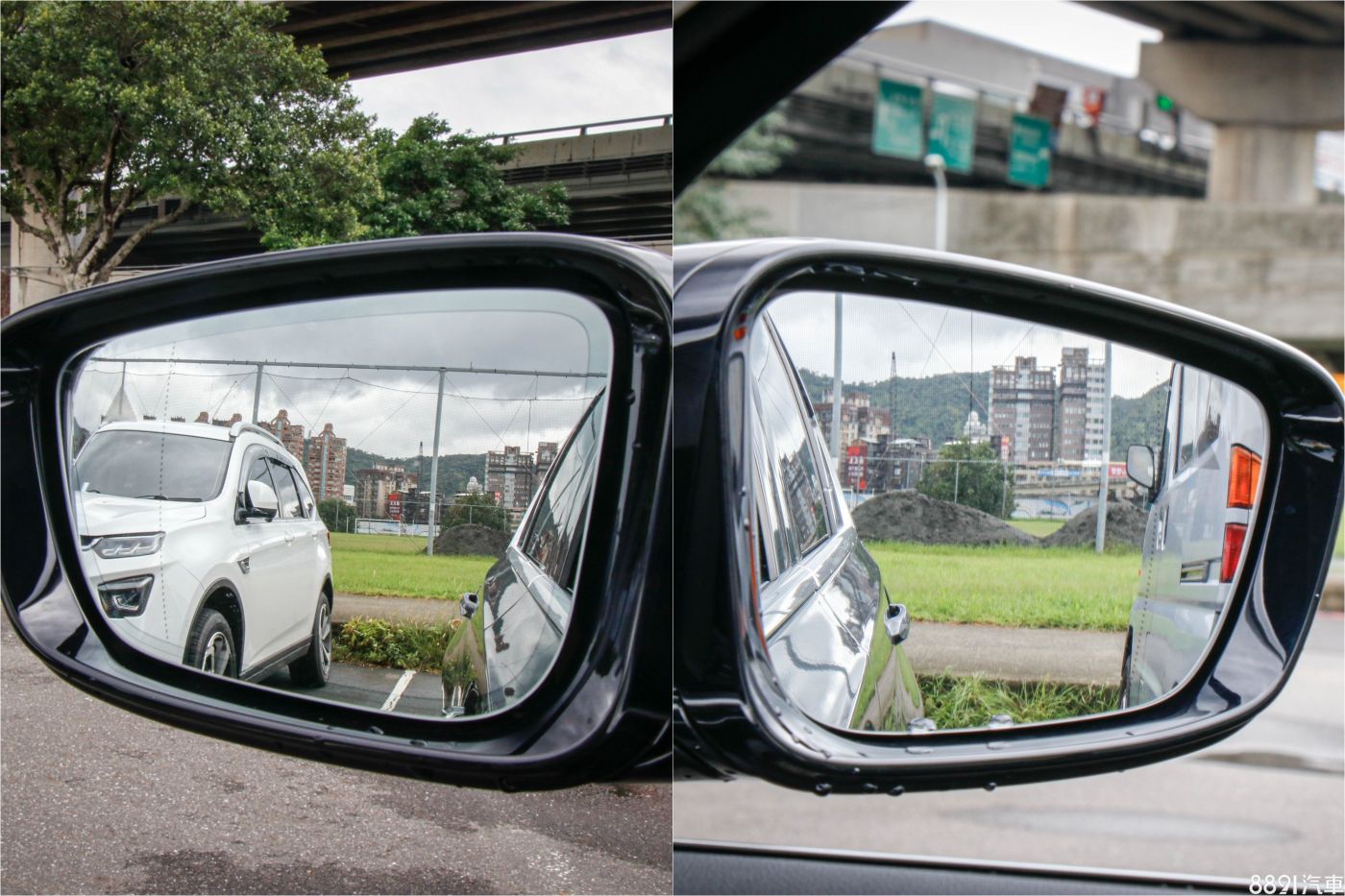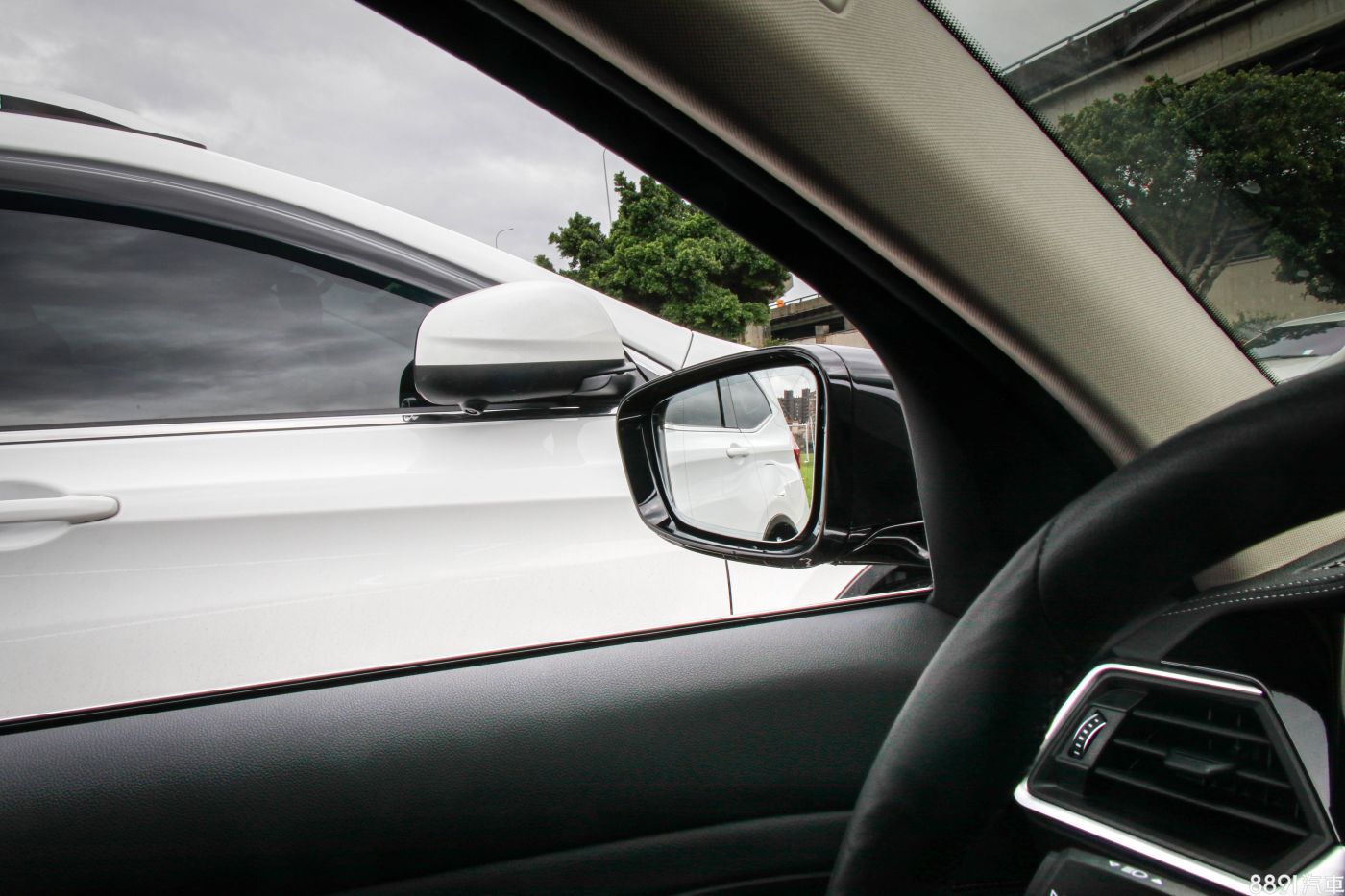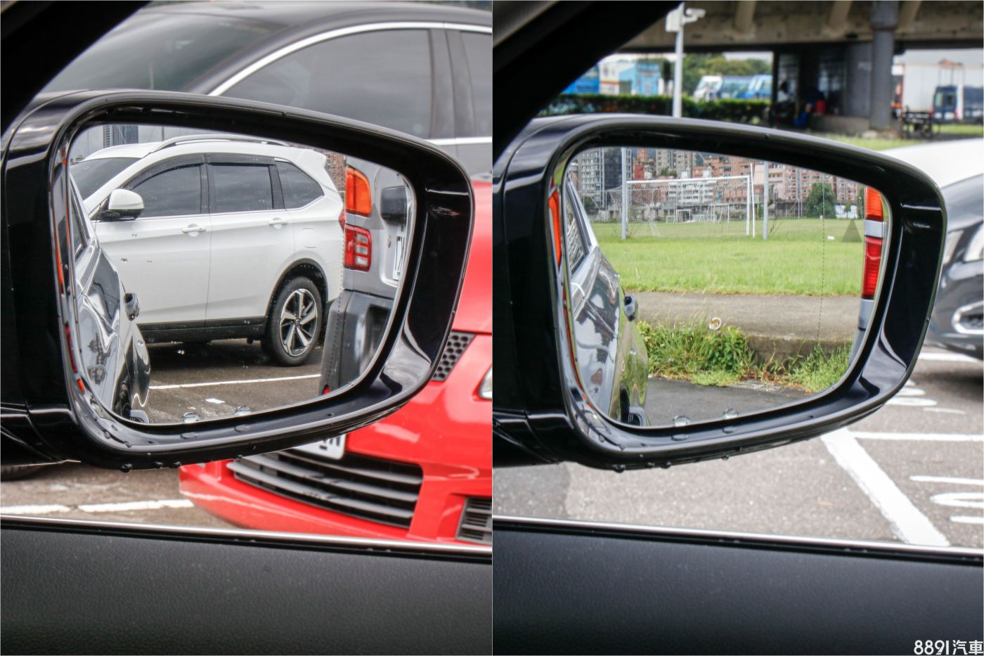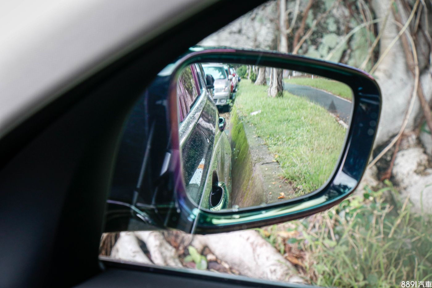 也可利用左側後視鏡觀察駕駛座門把,若門把在白線上或白線內,代表車尾已完整進入停車格。