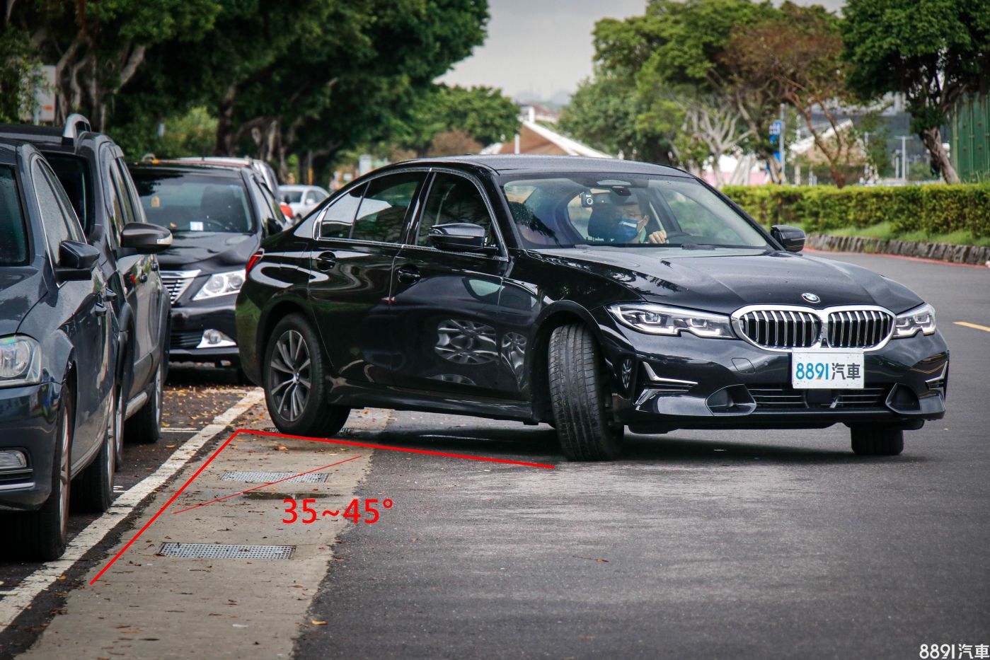 在方向盤右打到底的狀態下倒退,退至車身與停車格邊線呈現35~45度之間即可停下,這邊要注意若停車格長度越短、角度也要越大,才能一次到位進入停車格。