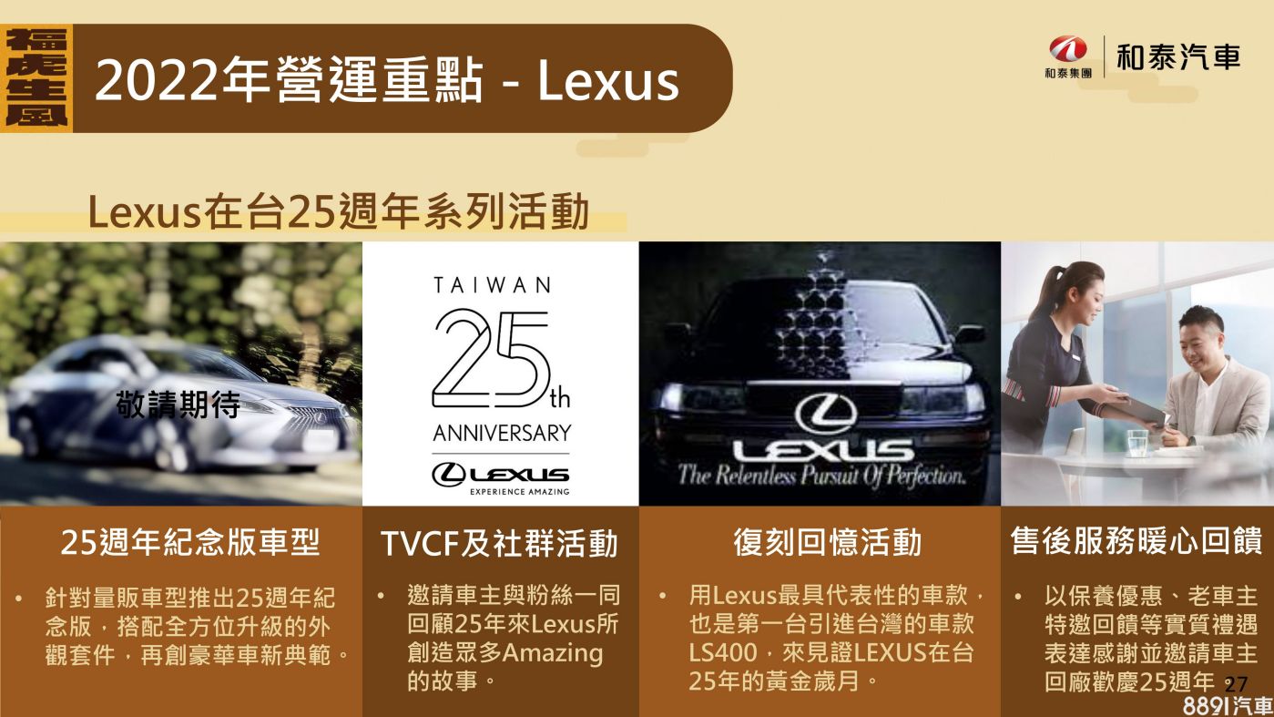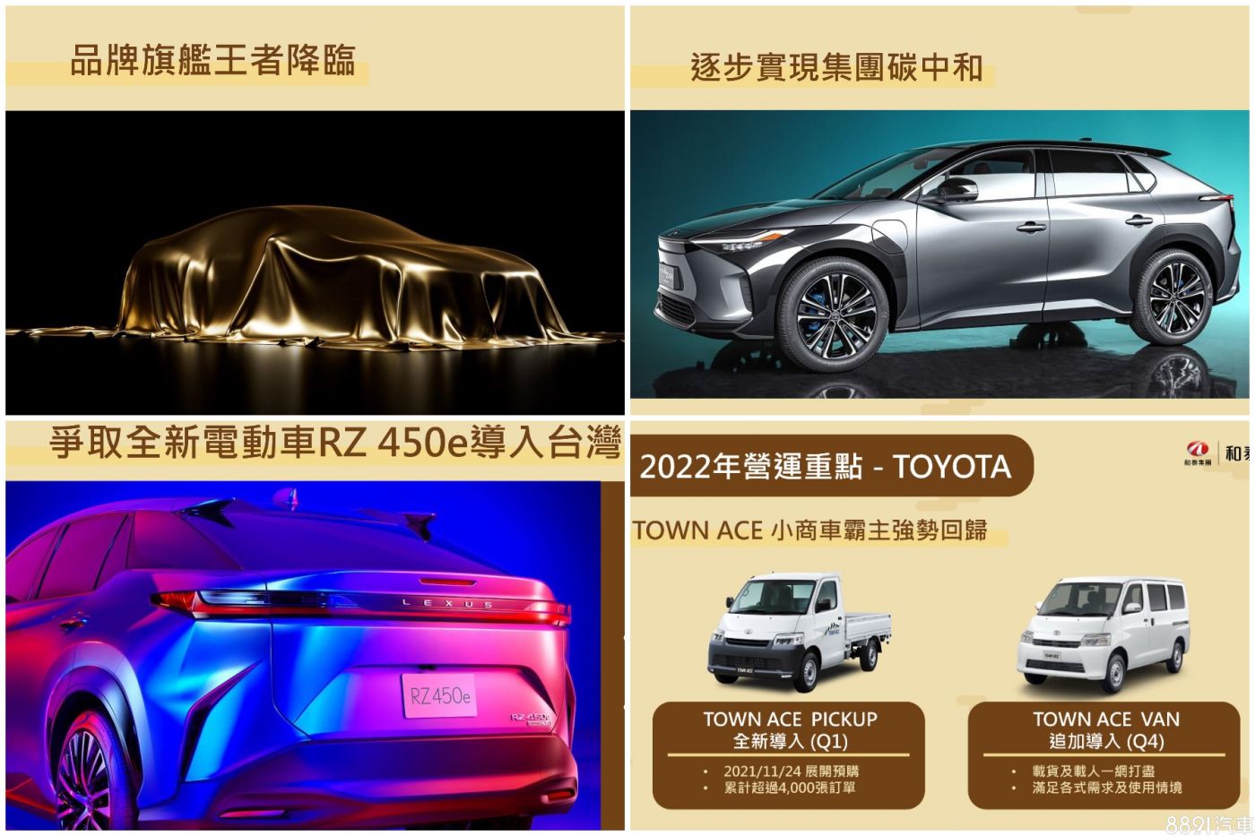 由於全球疫情及車用晶片的不確定性,和泰汽車預估2022年汽車市場規模為46萬台。今年預計推出的新車包含Toyota首款純電bZ4X(Q2)、Town Ace貨卡(Q1)和Van(Q4)、GR 86(Q3)、GR Supra手排版(Q4)、全新跨界旗艦車款Crown(Q4)、Lexus LC Limited Edition(Q1)、更多F Sport車型,並同時爭取全新電動車款RZ 450e之導入。