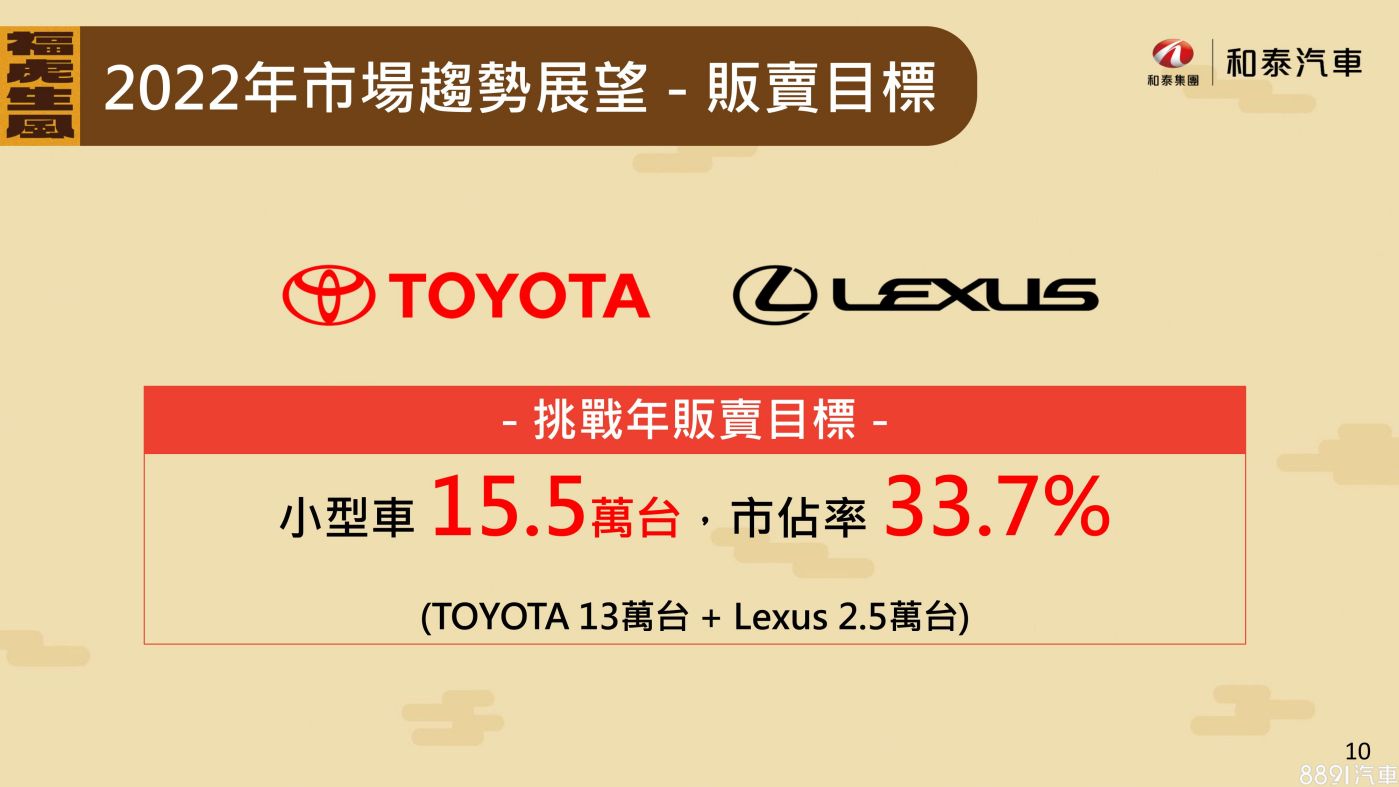 商用車部分亦將持續完整產品線,原廠並開出和泰汽車小型車15.5萬台之販賣目標、預計市佔率上看33.7%,另商用車市場因2021年六期法規、客戶提前購車的影響,預估市場總台數將下滑,冀望挑戰年販賣目標為9000台。