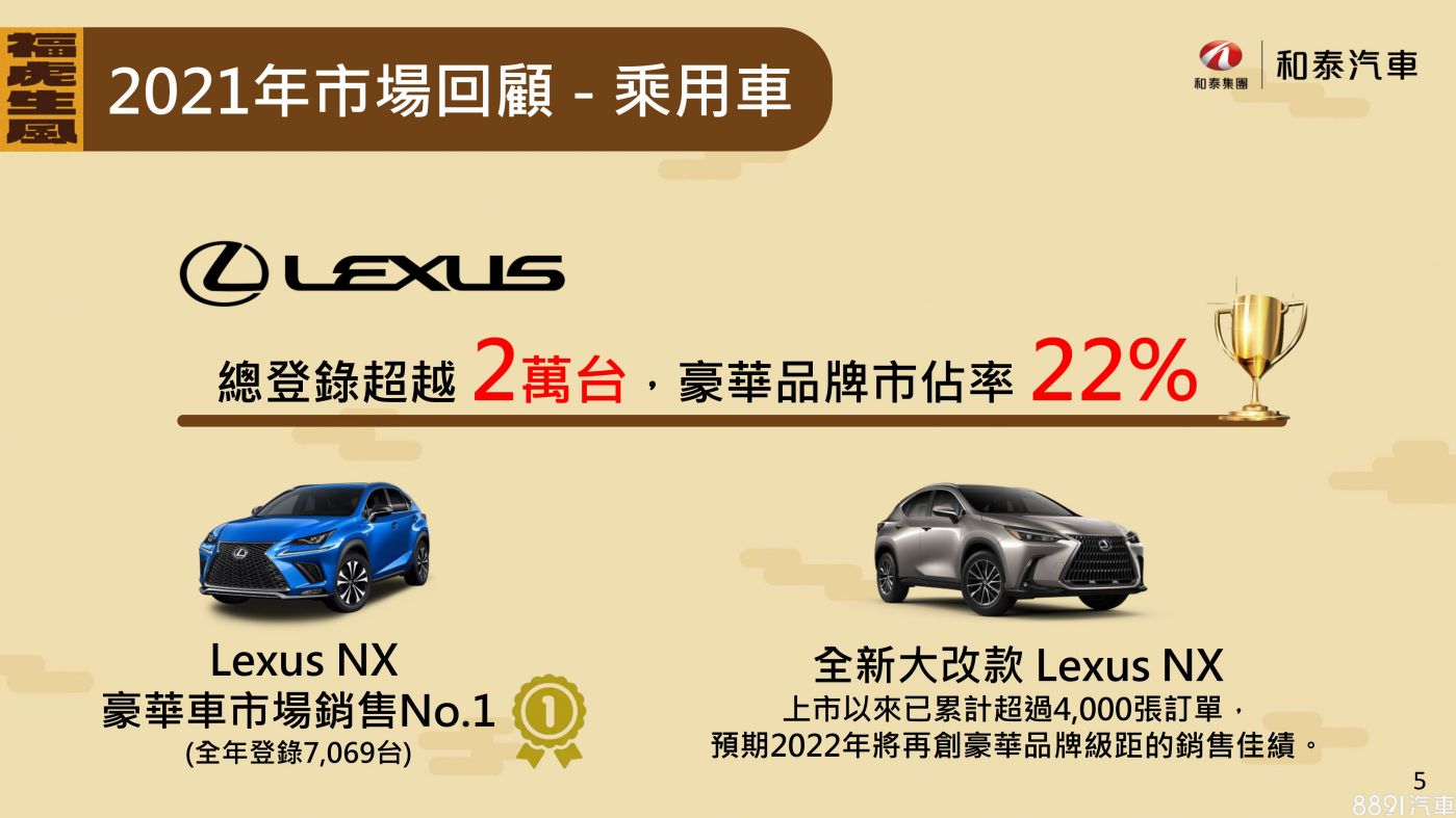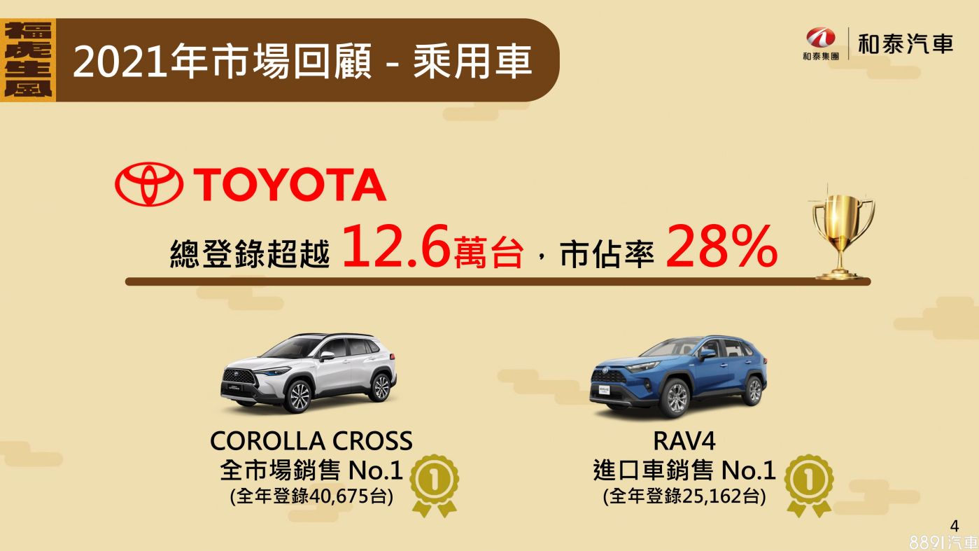 其中Toyota登錄12.6萬台,市佔率達28%,「新神車」Corolla Cross以40675台的成績,成為史上第一台年度銷售突破4萬台的SUV:Lexus亦登錄逾2萬台,在豪華品牌市佔率達22%;商用車方面3.49噸以上車款登錄共計9422台,市佔率33.2%,刷新和泰商用車在台銷售新紀錄。