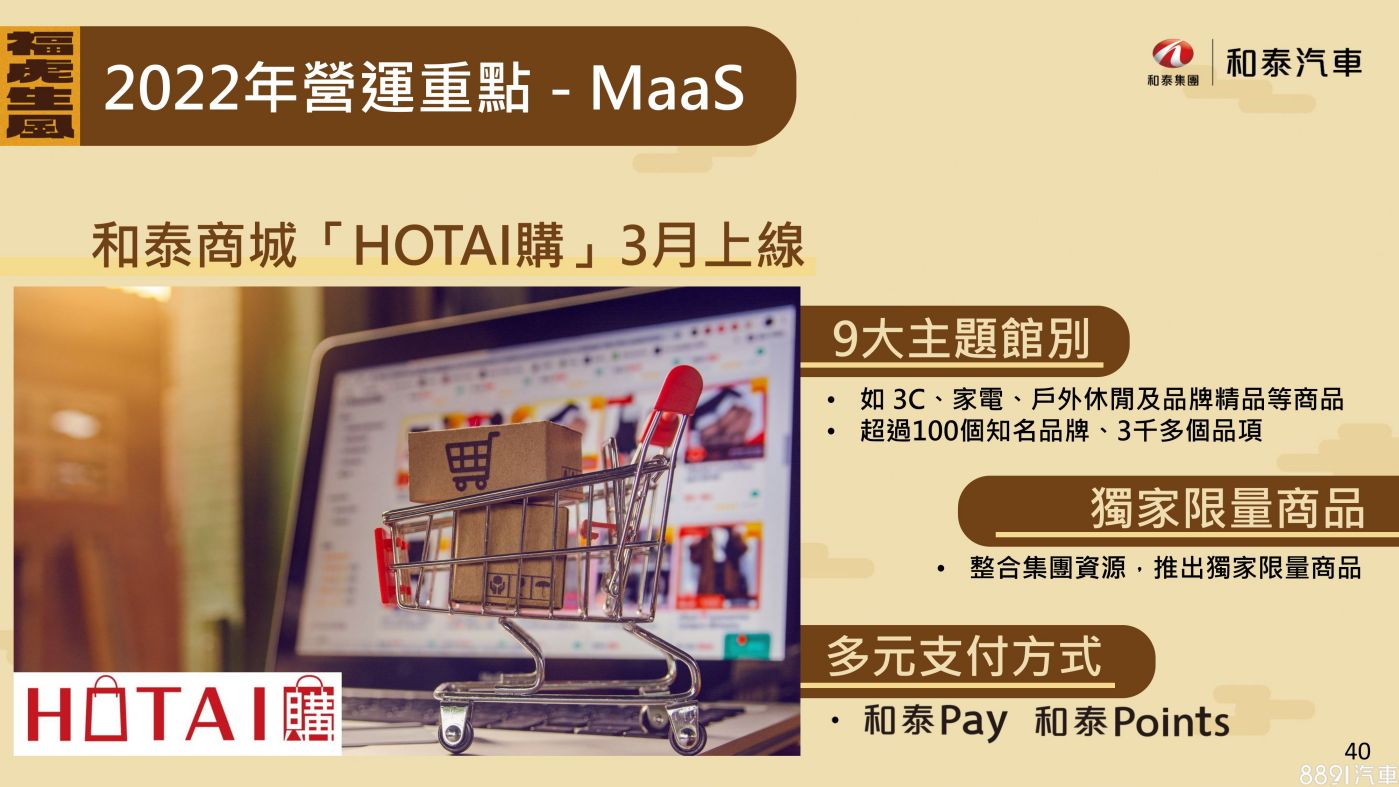 面對數位化浪潮,和泰集團以Mobility as a Service為願景,除了專注於汽車銷售與週邊事業,也致力於「移動需求」服務,擴大數位轉型的方向。「和泰商城」將於2022年3月開站,搭配和泰Pay與和泰Points等多元支付方式,打造更完整的集團數位服務生態系。