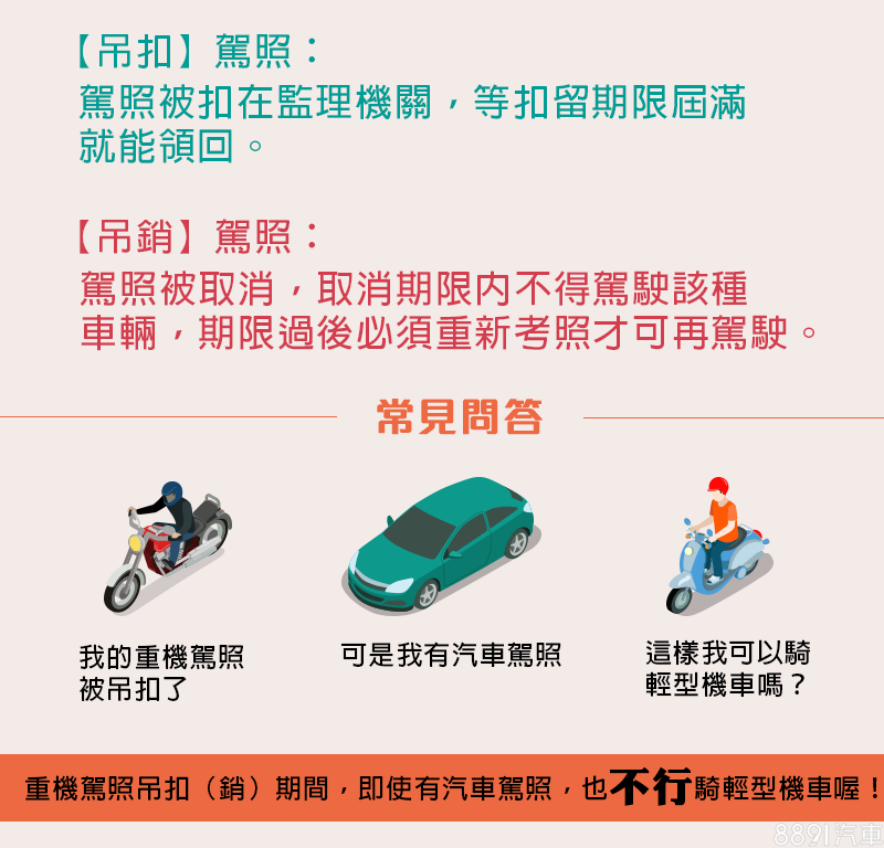 「吊扣」大家可以想成政府暫時沒收你的駕照,扣留一定時間後就會返還到駕駛人手中,駕照本身效力不會減少也不會被解除,目的就是為了讓違規者暫時無法駕駛車輛來達到嚇阻的作用;而「吊銷」則是直接取消該張駕照的效力,駕駛人將不再擁有駕駛車輛的權力,只能待規定期滿後重新考一張駕照才行。(圖/台北市區監理所)