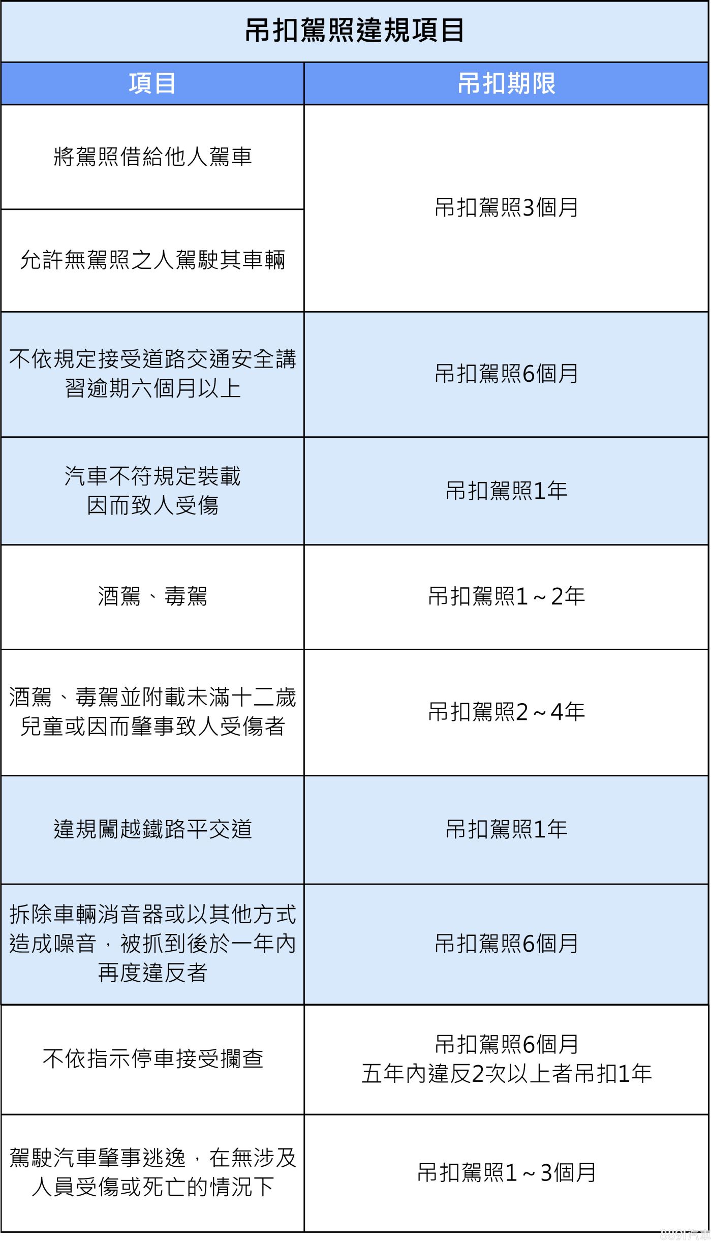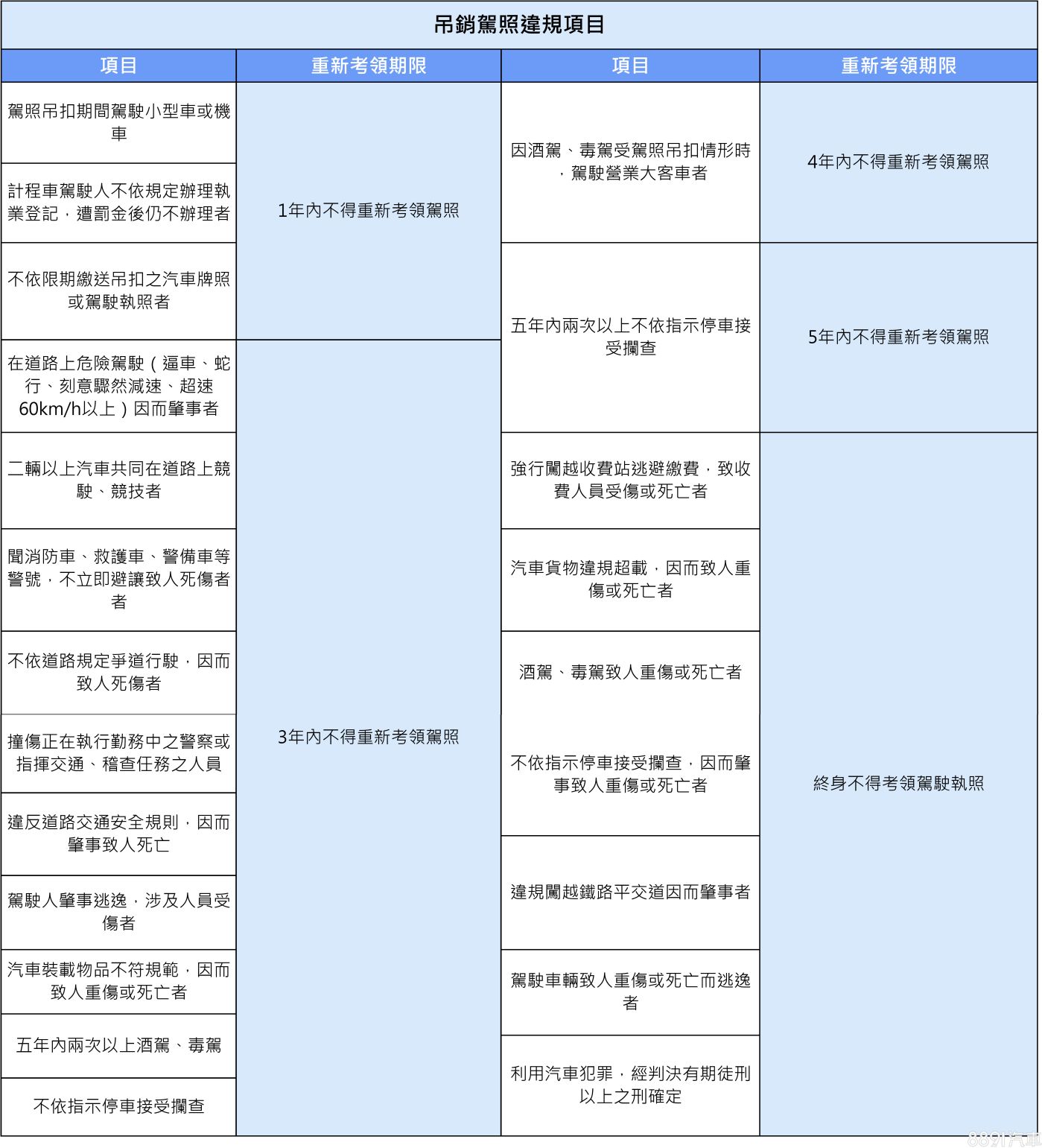 「吊銷」駕照則是針對違規情節最嚴重的處分,除了直接取消駕駛人的駕駛權利外,通常更會伴隨高額罰金與沒入車輛等措施。駕照被「吊銷」後也不是馬上就能重考一張,一般都需間格至少1年以上才能重新考照,甚至情節過於嚴重的違規項目,還可能面臨終身無法考照的命運。