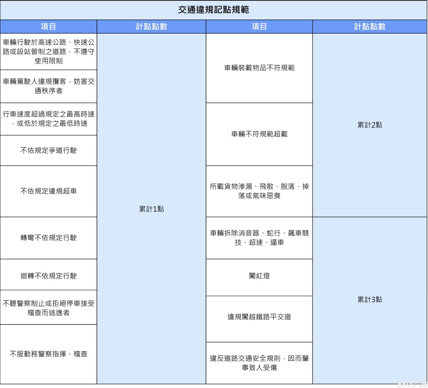 詳細違規項目與點數如上表所示,其中不乏看到路上常見的惡劣駕駛方式,大家可別以為違規罰單繳清了就沒事,各種小違規累計起來一不小心集滿六點,駕照可是會馬上被「吊扣」起來的,提醒大家千萬別忽略交通違規記點所帶來的影響!