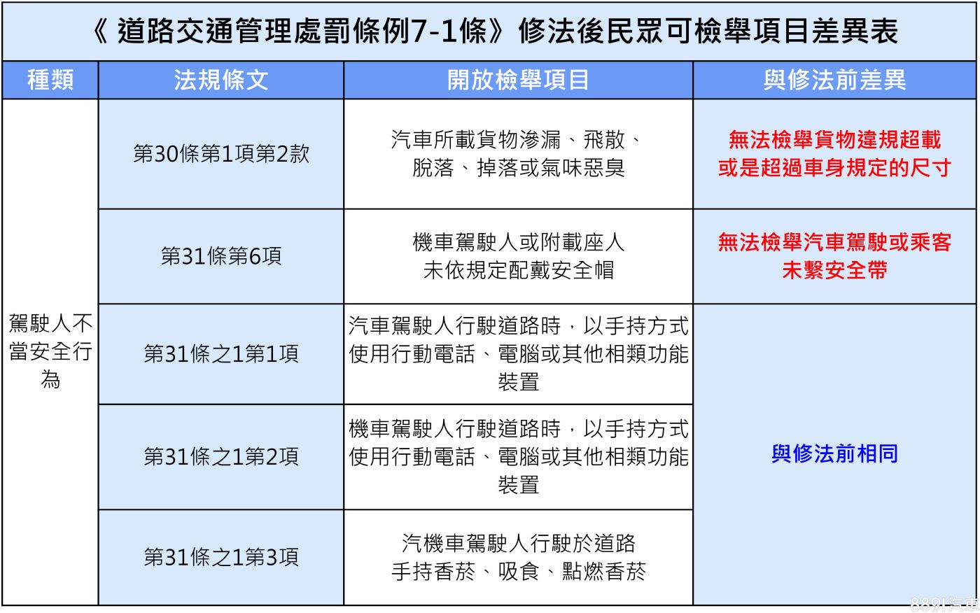 還有以往可檢舉的「汽車未繫安全帶」同樣因為單就影像舉證困難而被取消了,但違規事實明確的「機車未戴安全帽」和「汽機車駕駛行駛途中違規使用手機、抽菸」等行為,仍舊保留在民眾可檢舉的範圍內。