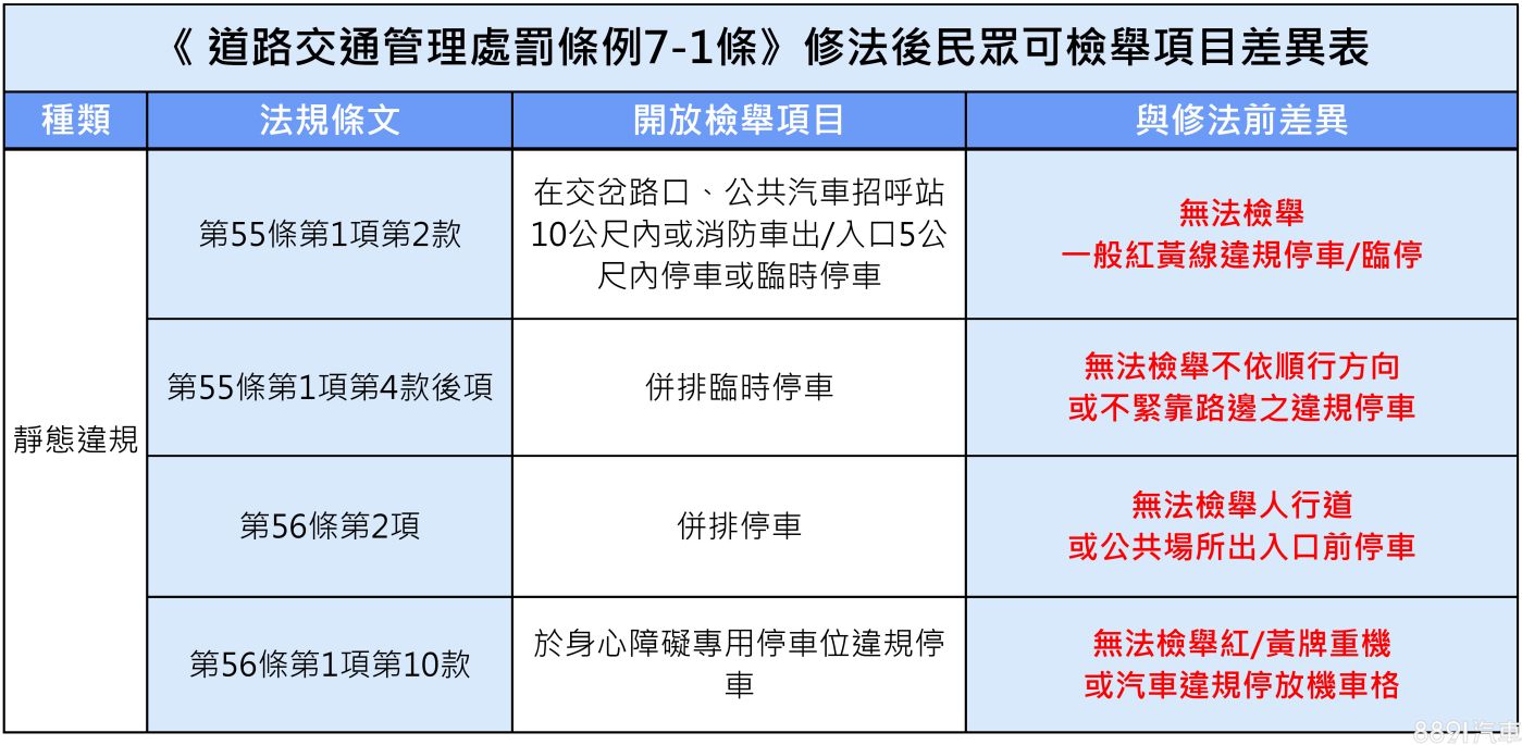 最後就是此次修法爭議性最大的「靜態違規」項目了,以往遭民眾檢舉案件比例最多的就是「違規停車」,但這次修法後卻大幅縮減民眾對於「違規停車」的檢舉範疇,變成只有停靠在路口、公車招呼站或是消防車出入口附近、違規並排停車或是占用身心障礙專用車位才開放民眾檢舉違停。平時各種常見的違停像是「逆向停車」、「在人行道上停車」、「一般紅黃線停車」、「重機停放機車格」等,未來民眾將無法自行檢舉。