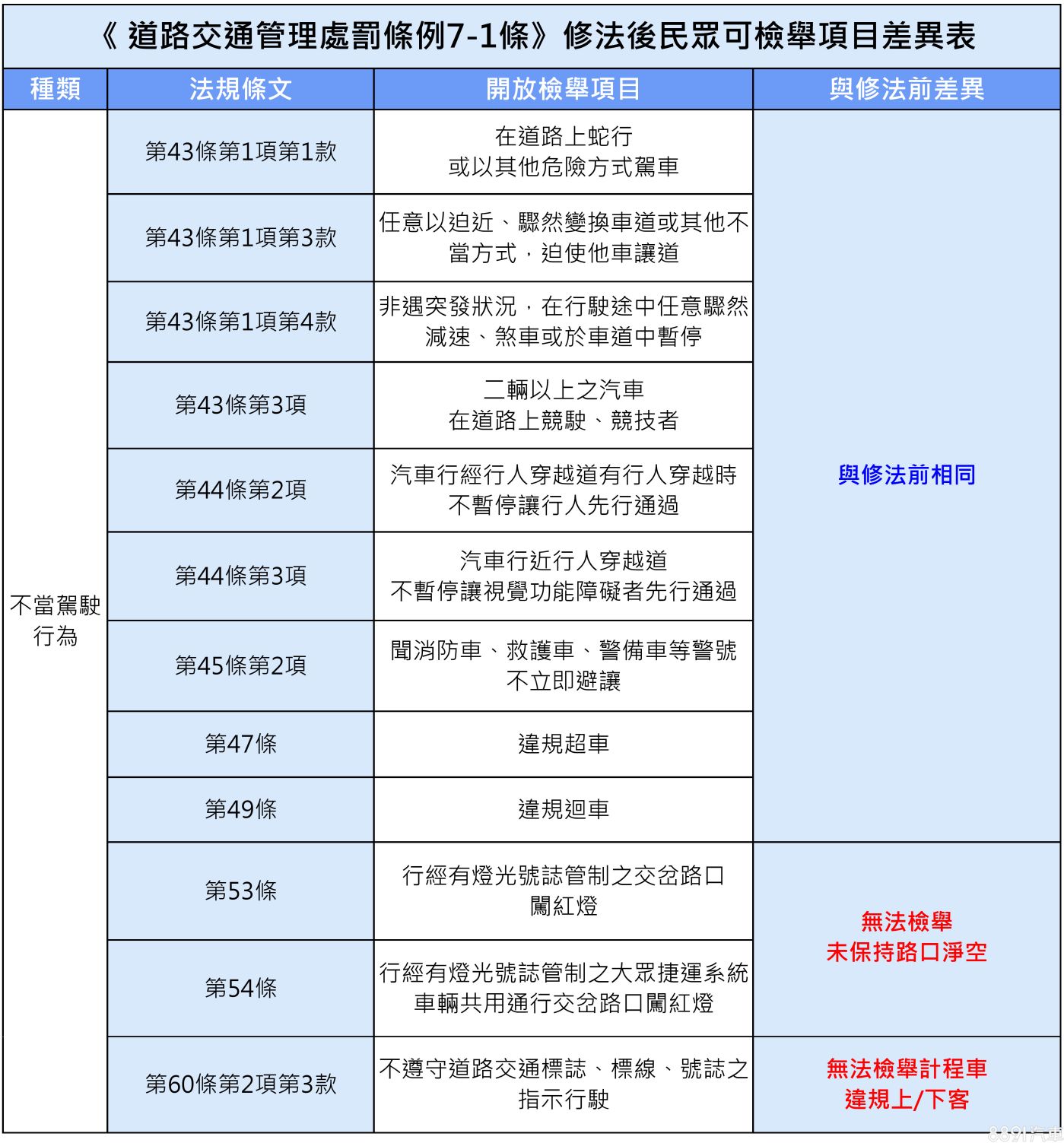 以往民眾只要發現相關違規行為都可依法進行檢舉,但在2020年修正案後卻只剩下46個違規項目可以選擇,相較之下當然差很多!以下就帶大家來把46個檢舉項目一條條攤開審視,究竟有哪些違規項目可以自行蒐證檢舉,而哪些又只能報警請警方到場開單呢?
