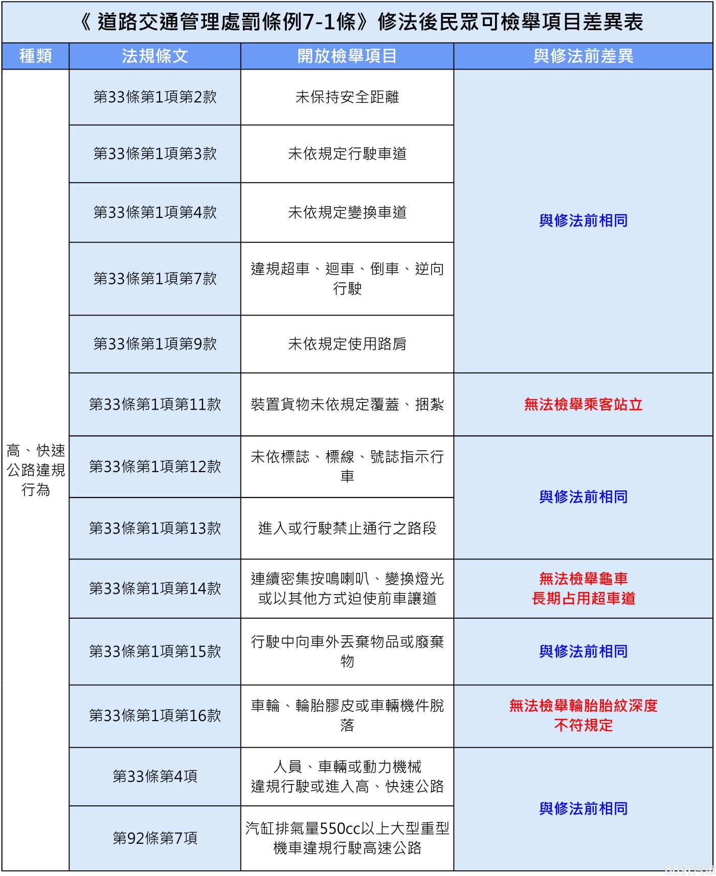 在「高、快速公路」的動態違規項目中,同樣也取消部分違規情節相對輕微的項目,像是「乘客違規站立」、「龜車長期佔用超車道」與「輪胎胎紋不符規定」等不會立即造成公眾安全的行為,就被移出至未來民眾可檢舉的項目之外。