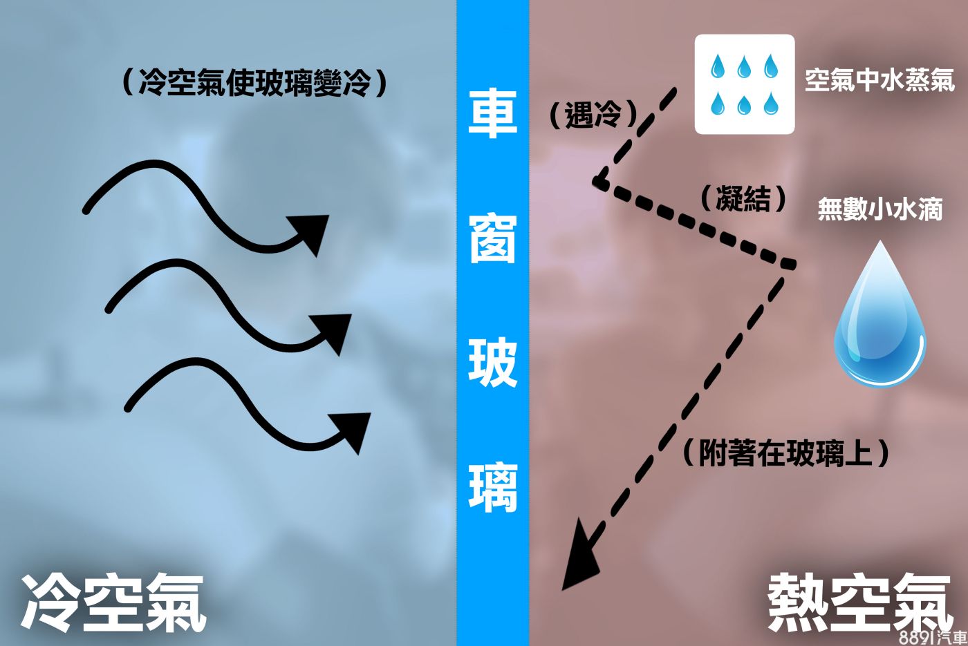 我們都知道在不同溫度下的相對濕度並不相同,溫度越高,飽和蒸氣壓就越高,能含納的水氣量也越多;反之同樣的水氣量遇到冷玻璃後溫度瞬間降下,就會超過該溫度級距的飽和蒸汽壓達到「露點」,這時候過量的水氣就會凝結成液態水附著在冷玻璃上面,大量附著在冷玻璃上面的微小水珠,正是造成我們視線受阻的原因。