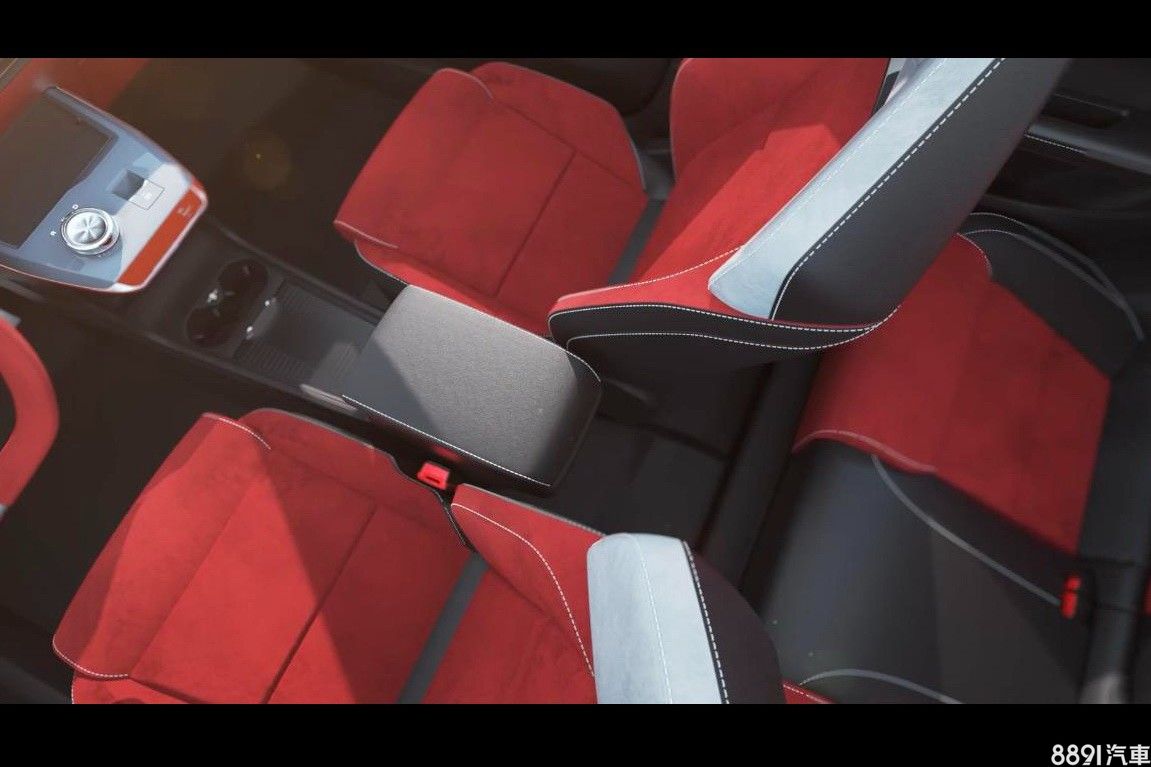 座椅以紅、白、黑色調搭配,視覺鮮明度夠,中央鞍座看起來置物空間相當充裕,雖然車長僅4287mm,但軸距達2705mm的新作,預期乘坐空間不會遜於中型產品。