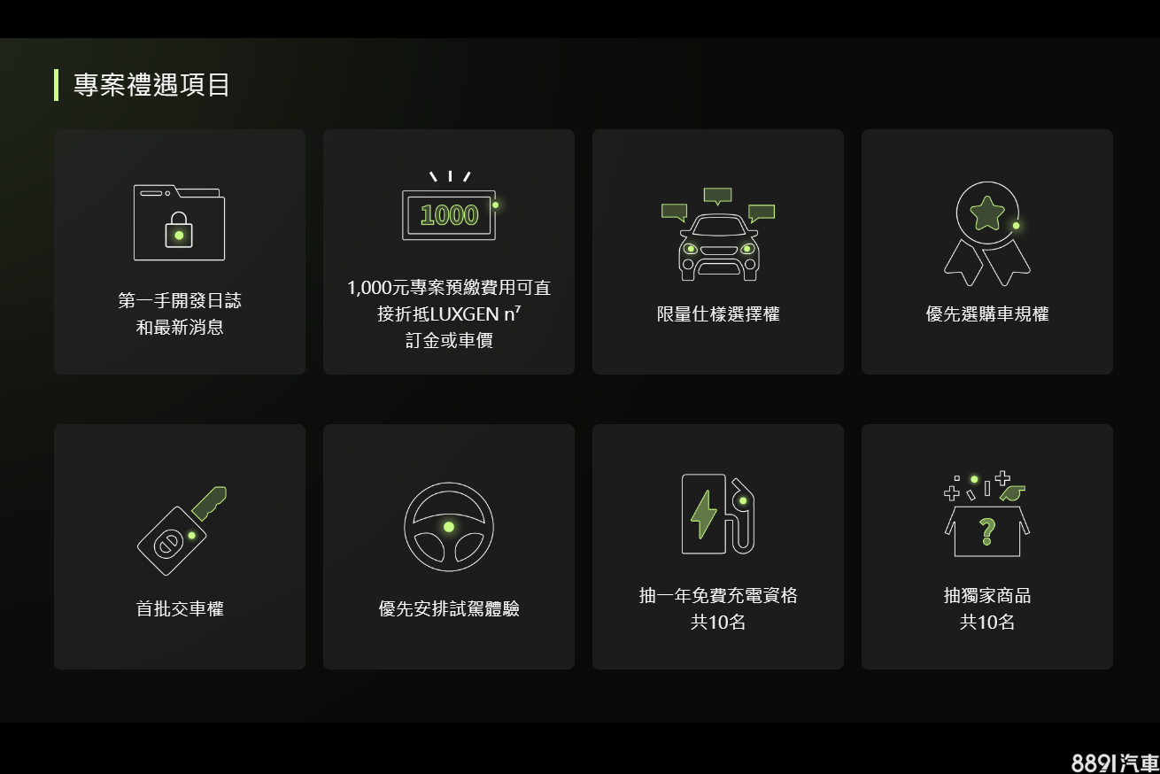 在2022/10/15前只要在線上預繳1千元,就能「成功卡位」,除了可優先交車,屆時還會有限定專屬禮遇,如專屬NFT、第一手開發日誌、最新通知消息、搶先試駕體驗、優先選購權、首批交車權、限量仕樣選擇權等,此外,原廠也確認,新車「入手價不到百萬」!並可於2023年下半年起陸續交車。