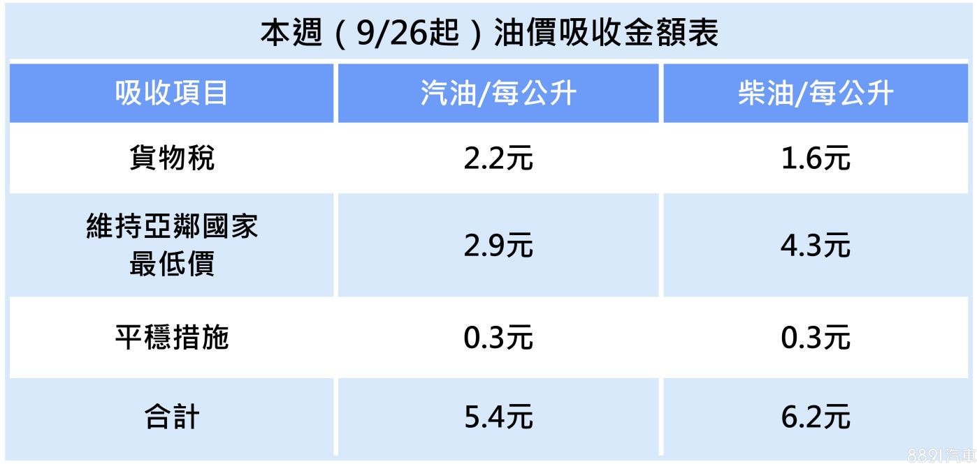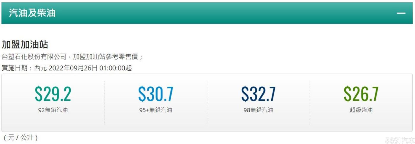 台灣中油公司自2022/9/26凌晨零時起汽、柴油售價不予調整,參考價格分別為92無鉛汽油每公升29.2元、95無鉛汽油每公升30.7元、98無鉛汽油每公升32.7元、酒精汽油每公升30.7元、超級柴油每公升26.9元、液化石油氣每公升14.6元。