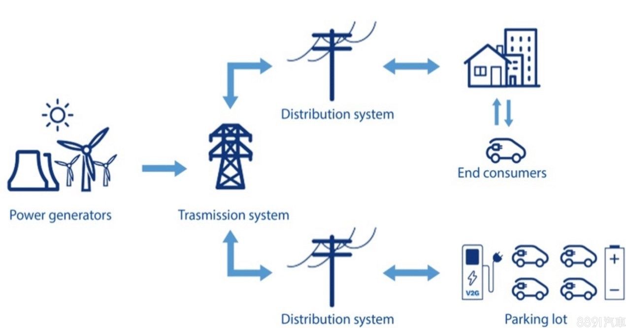 V2G「Vehicle to Grid」是反向供電的深度應用,概念是能夠當作都市電力規劃的一環,在都市用電量大的尖峰時段,每輛電動車可視為儲能設施,用支援V2G的充電樁來反向為電網供電,減輕電網負擔,離峰時則為電動車充電。
