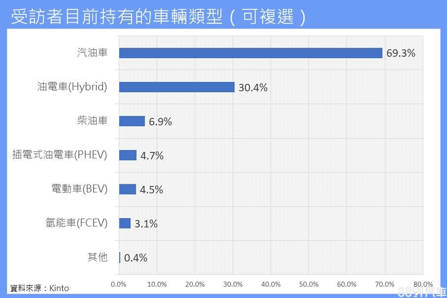 這些受訪者中,將近七成目前是汽油車主,另有約莫三成名下持有油電車款,反倒目前已經是電動車主的,僅約20餘位,比例只佔4.5%。