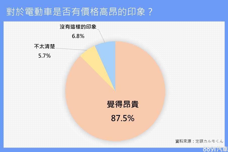 其中一個原因,卡在相當現實的問題-價格。5千多位受訪者中,多達87.5%同意有「電動車就是貴」的印象,即便是平價品牌推出的電動車,售價上往往跟同型燃油車相比,仍存在不小的落差。
