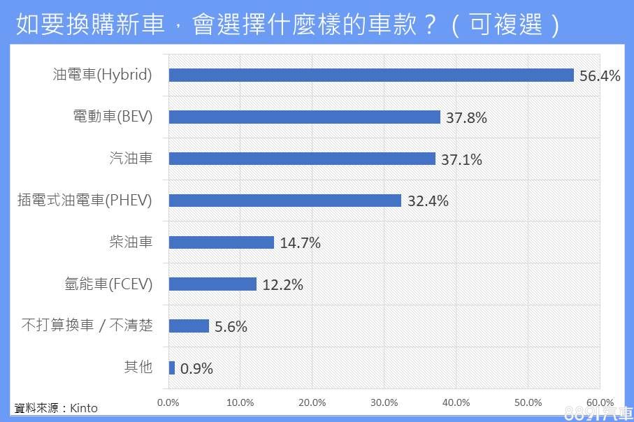 結果顯示,若要選購下一款新車,Hybrid油電車款最獲青睞,有意購入者多達56.4%。居次則是電動車與汽油車,兩者得票數相當,差距不到1%。另有約三成受訪者願意將可插電的PHEV納入候選考量,票數亦相去不遠。