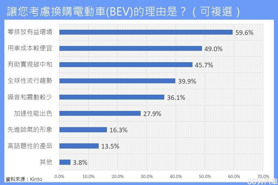 針對回答有意購買電動車的200餘位民眾,調查也進一步探訪其理由。其中將近6成認為零排放對環境更友善,是多數人願意選擇電動車的誘因之一,而行駛成本較低及有助於實現碳中和,也均得到近5成的認同;另有4成受訪者則將購買電動車視為全球性的趨勢。