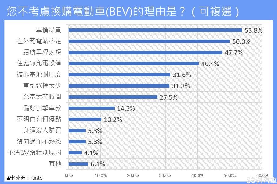 至於其他對電動車興趣缺缺的受訪者而言,不意外仍以價格高昂作為最大選購障礙,超過半數表示同感。此外,出外充電據點不夠普及、行駛里程不足、住家缺乏充電設備等等,也都有著四~五成的得票數,是降低電動車購買意願的主要原因。