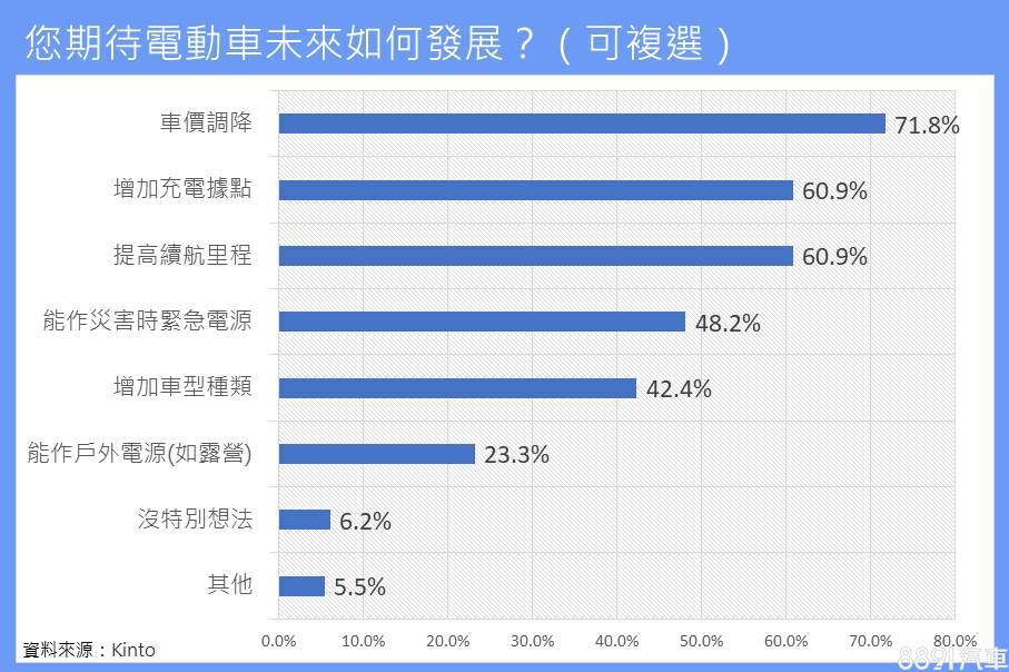 另一方面,雖說作為未來趨勢,但電動車畢竟仍屬發展中的動力技術,若想提升消者購買電動車的意願,超過7成受訪者期待電動車能以更親民的價格販售,並有6成希望能提高充電設施的普及率和提升未來電動車的續航表現。